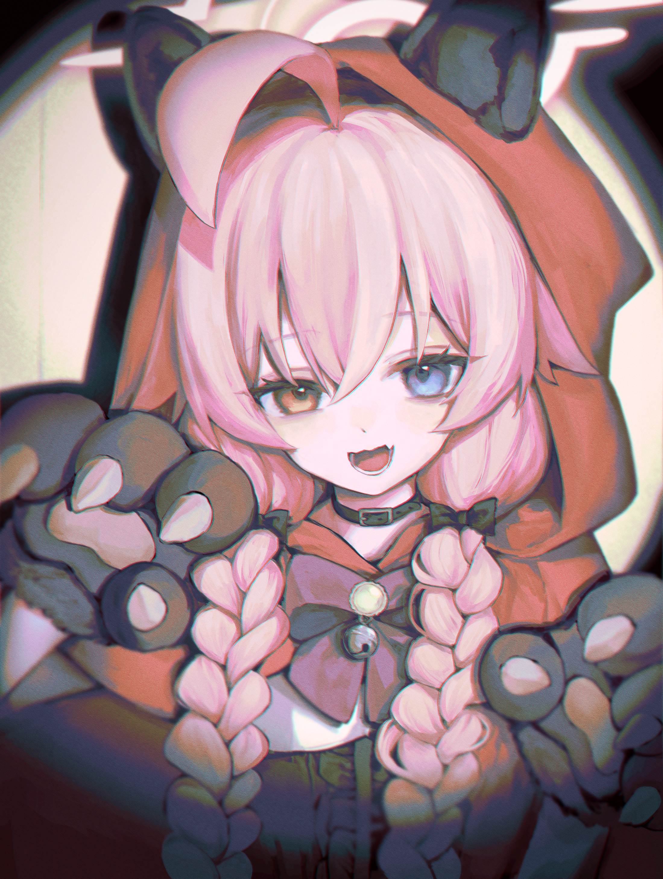 1girl absurdres ahoge animal_ears animal_hands bell black_bow black_choker black_gloves blue_archive blue_eyes bow braid choker commentary fake_animal_ears fang gloves hair_between_eyes hair_bow halloween halloween_costume halo heterochromia highres hoshino_(blue_archive) jingle_bell long_hair looking_at_viewer open_mouth paw_gloves pink_hair pink_halo red_bow skin_fang smile solo untranslatable_commentary twin_braids upper_body yagiusagi yellow_eyes