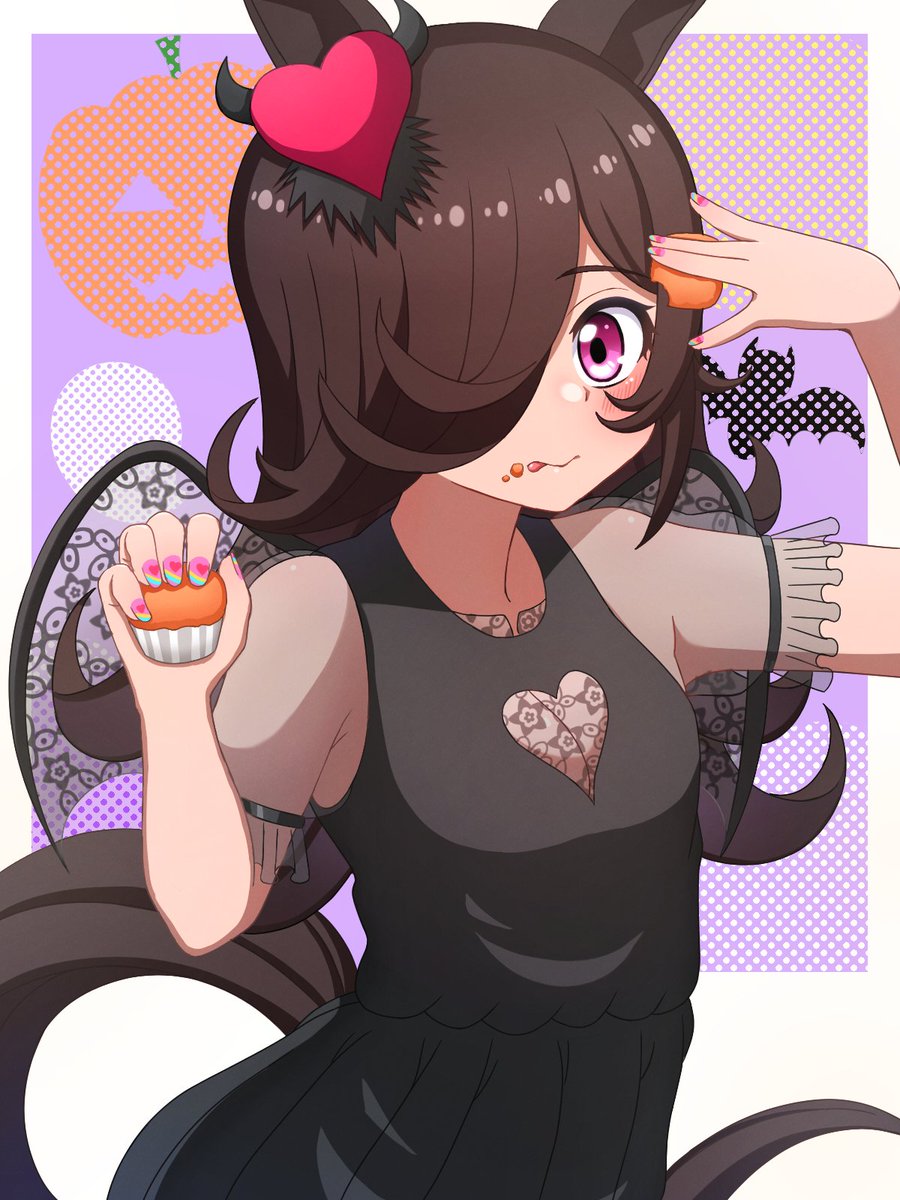 1girl animal_ears black_dress black_wings brown_hair closed_mouth clothing_cutout commentary cupcake dress fake_wings food food_on_face hair_ornament hair_over_one_eye halloween halloween_costume heart heart_cutout heart_hair_ornament highres holding holding_food horse_ears horse_girl horse_tail jack-o'-lantern katsushika_yuki licking_lips long_hair looking_at_viewer pleated_dress purple_eyes rice_shower_(umamusume) see-through_clothes see-through_sleeves short_sleeves smile solo standing tail tongue tongue_out umamusume wings