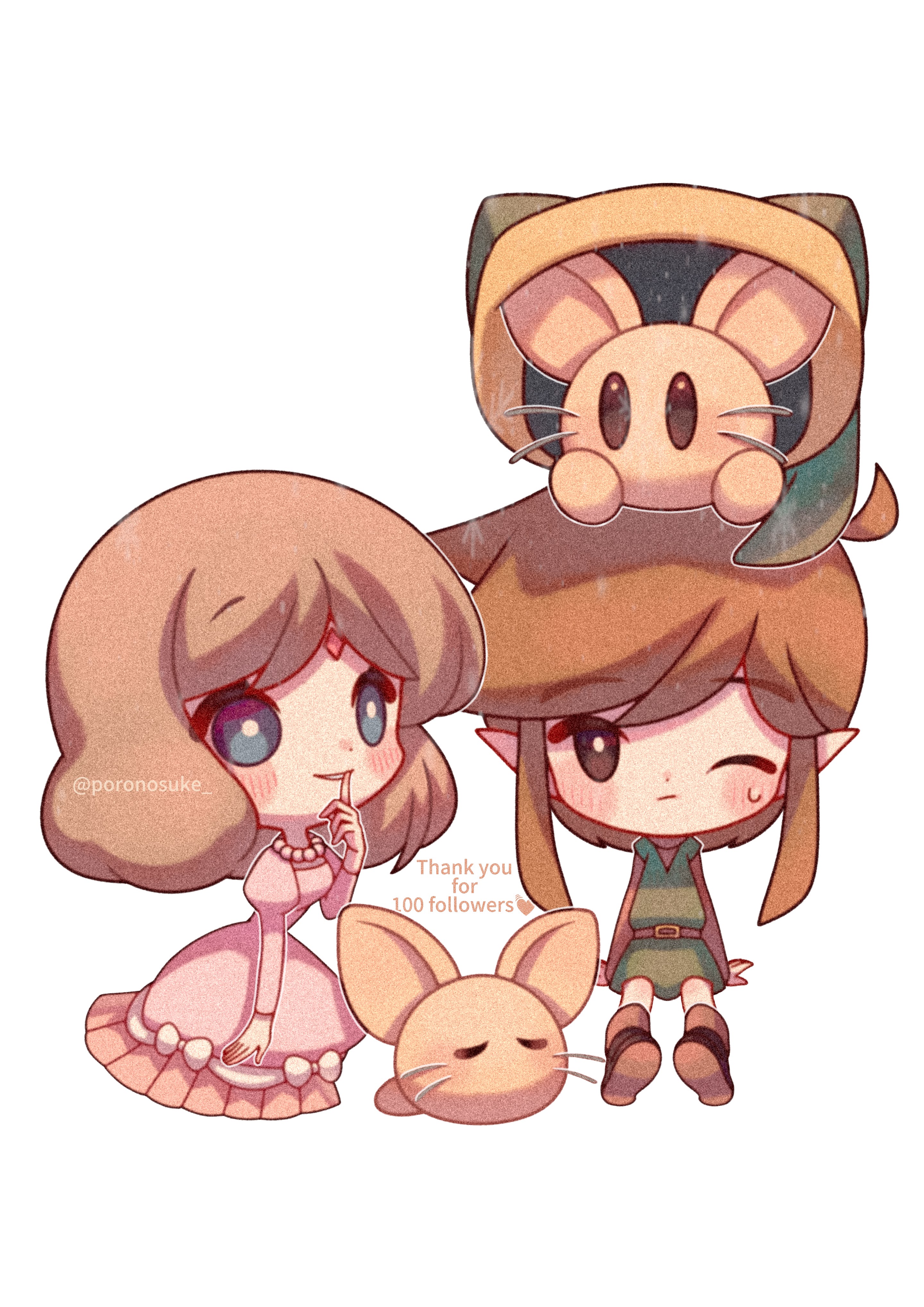 1boy 1girl absurdres animal animal_on_head belt blue_eyes blush bow bright_pupils brown_belt brown_shirt chibi closed_mouth dress dress_bow finger_to_mouth green_headwear green_tunic highres jewelry juliet_sleeves link long_sleeves necklace nintendo on_head one_eye_closed parted_lips pearl_necklace pink_dress pointy_ears pols_voice poronosuke princess_zelda puffy_sleeves shirt shushing sidelocks simple_background sitting thank_you the_legend_of_zelda the_legend_of_zelda_(nes) tunic twitter_username white_background white_bow white_pupils