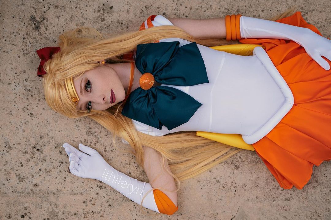 1girl aino_minako bishoujo_senshi_sailor_moon blonde_hair blue_eyes bow cosplay gloves ithileryn long_hair photo_(medium) real_life red_bow sailor_venus sailor_venus_(cosplay) short_sleeves skirt
