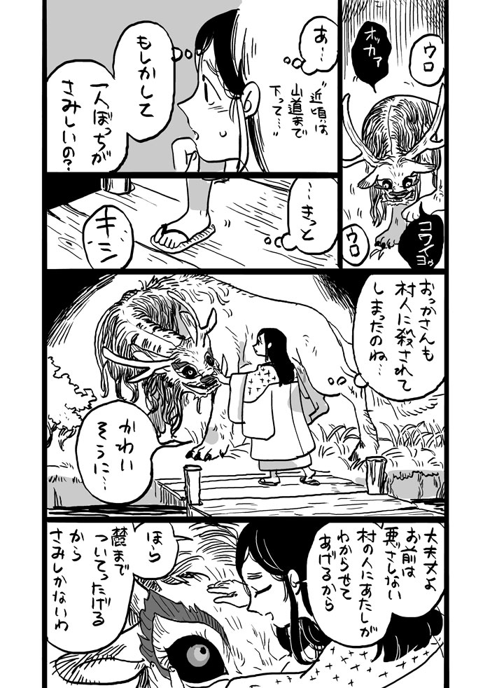 1girl bridge closed_eyes commentary grass greyscale hand_to_own_mouth japanese_clothes kimono long_hair long_sleeves monochrome monster open_mouth original outdoors petting sandals smile sweatdrop translation_request walking waosatogo wide_sleeves worried zouri