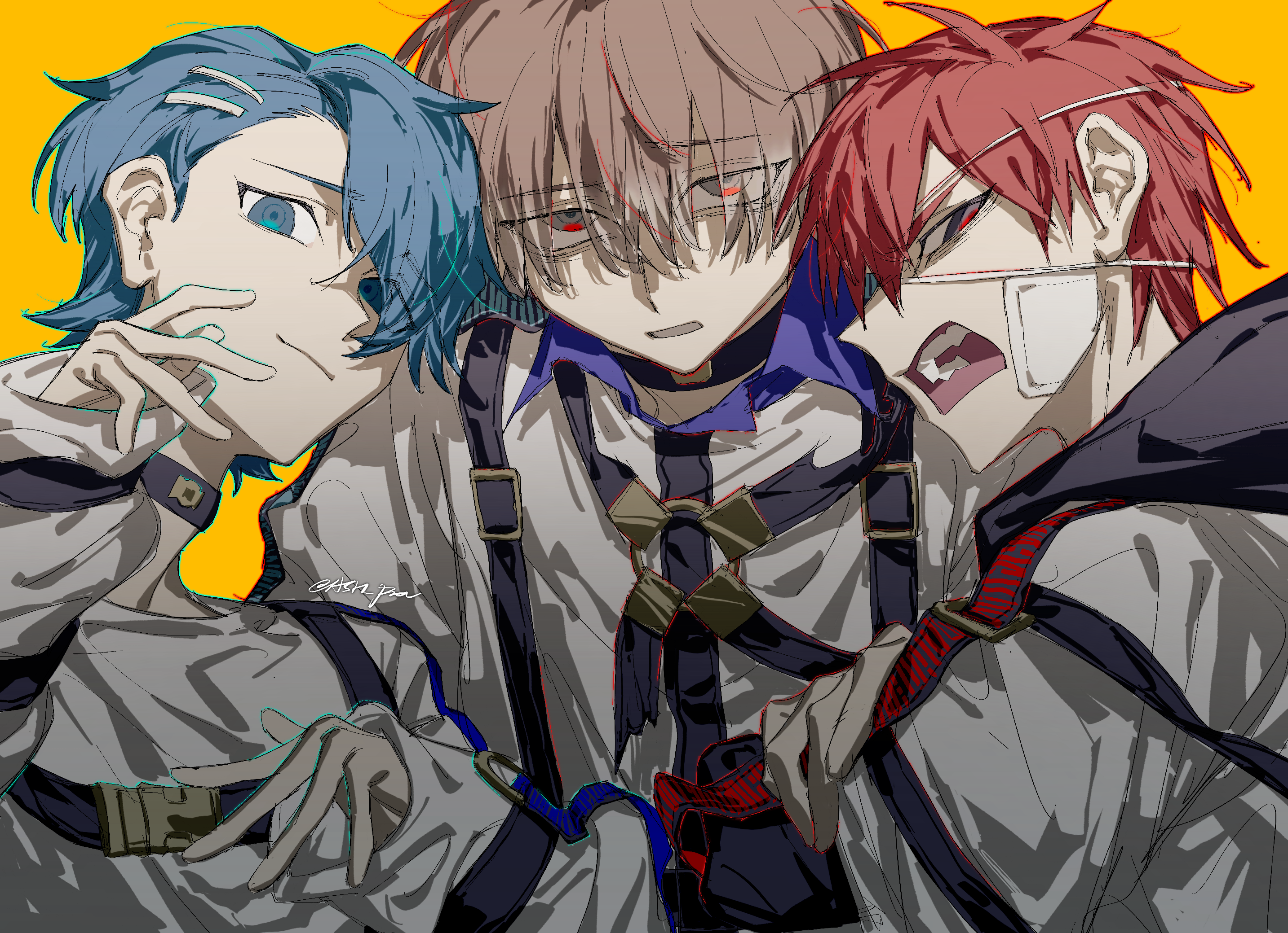3boys ash_(ash_proc) bandaid bandaid_on_face black_choker black_garter_straps blue_eyes blue_hair brown_eyes choker closed_mouth eyepatch facing_to_the_side facing_viewer garter_straps grey_eyes highres kajiyama_fuuta kayano_mikoto looking_at_viewer male_focus milgram multiple_boys open_mouth red_hair sakurai_haruka_(milgram) straitjacket teeth twitter_username yellow_background