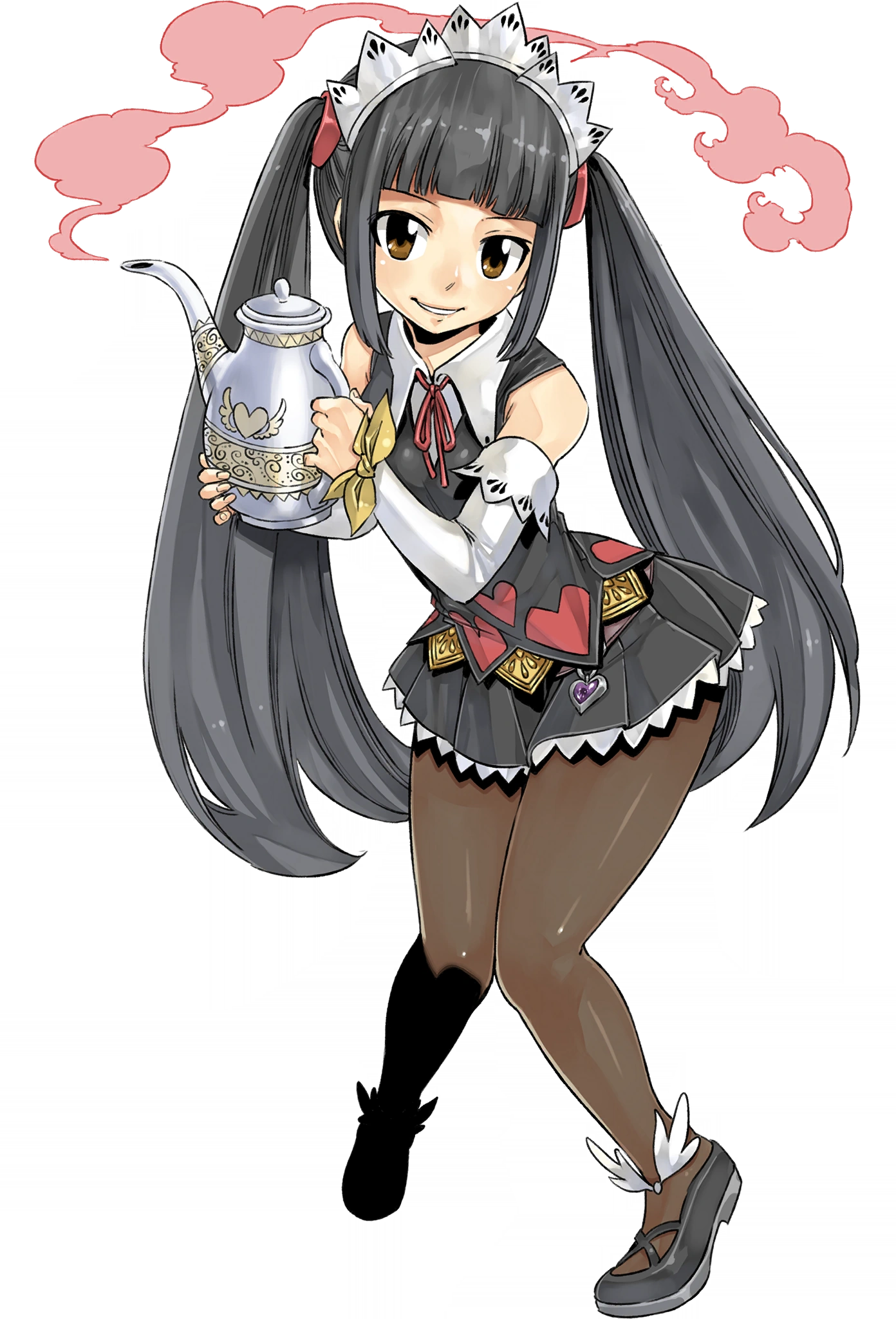 1girl black_hair black_pantyhose black_shoes black_skirt black_vest brown_eyes collared_shirt detached_sleeves full_body gate_of_nightmares highres holding holding_teapot leah_(gate_of_nightmares) long_hair looking_at_viewer maid maid_headdress mashima_hiro miniskirt necktie official_art pantyhose pleated_skirt red_necktie shirt shoes skirt solo steam teapot transparent_background twintails vest white_shirt white_sleeves