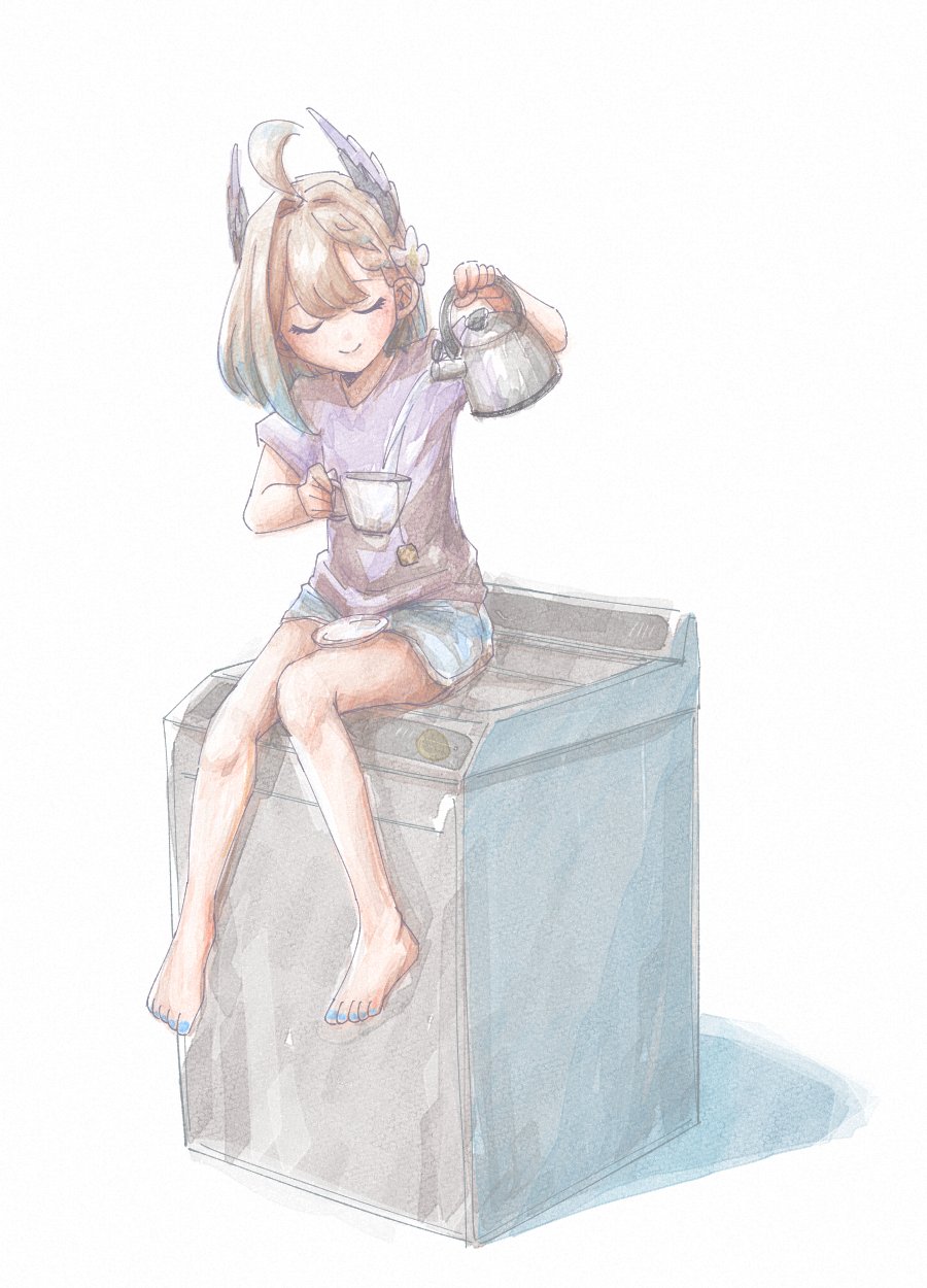 1girl ahoge barefoot blonde_hair blue_nails blue_shorts blush braid closed_eyes commentary cup english_commentary enna_alouette flower hair_flower hair_ornament head_wings highres holding holding_cup kettle medium_hair mirinmarin multicolored_hair nijisanji nijisanji_en plate pouring purple_shirt shirt shorts simple_background sitting sitting_on_object smile solo t-shirt tea teacup two-tone_hair virtual_youtuber washing_machine white_background wings