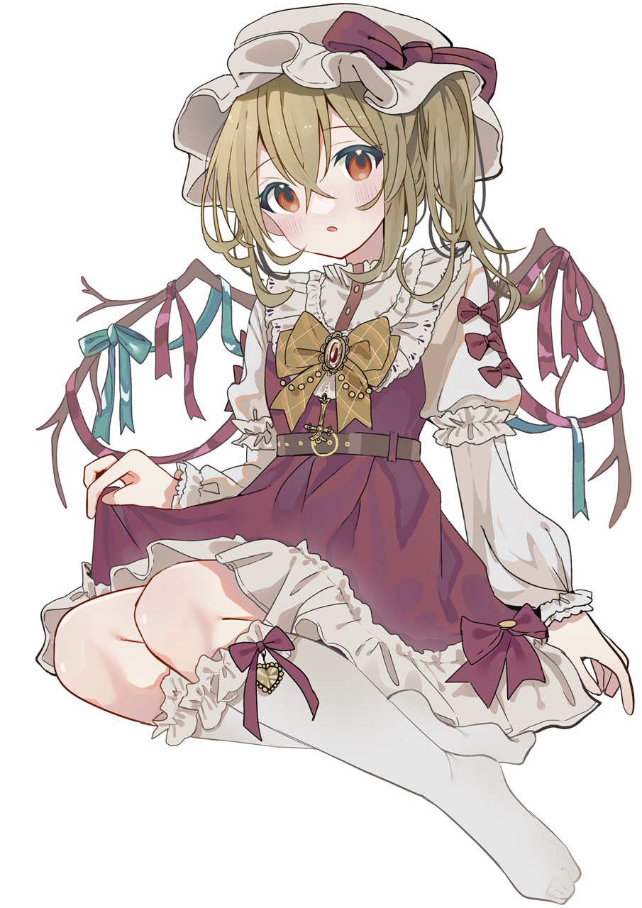 1girl alternate_costume ascot belt belt_buckle blonde_hair blue_ribbon blush blush_stickers bow brown_belt buckle buttons commentary_request curtsey dress flandre_scarlet flat_color frilled_dress frilled_sleeves frilled_socks frills gem hat hat_bow highres invisible_chair juliet_sleeves kneehighs long_sleeves medium_hair mob_cap one_side_up open_mouth puffy_sleeves red_bow red_dress red_eyes red_ribbon ribbon simple_background sitting skirt_hold socks solo tamagogayu1998 touhou white_background white_hat white_socks wing_ribbon wings yellow_gem