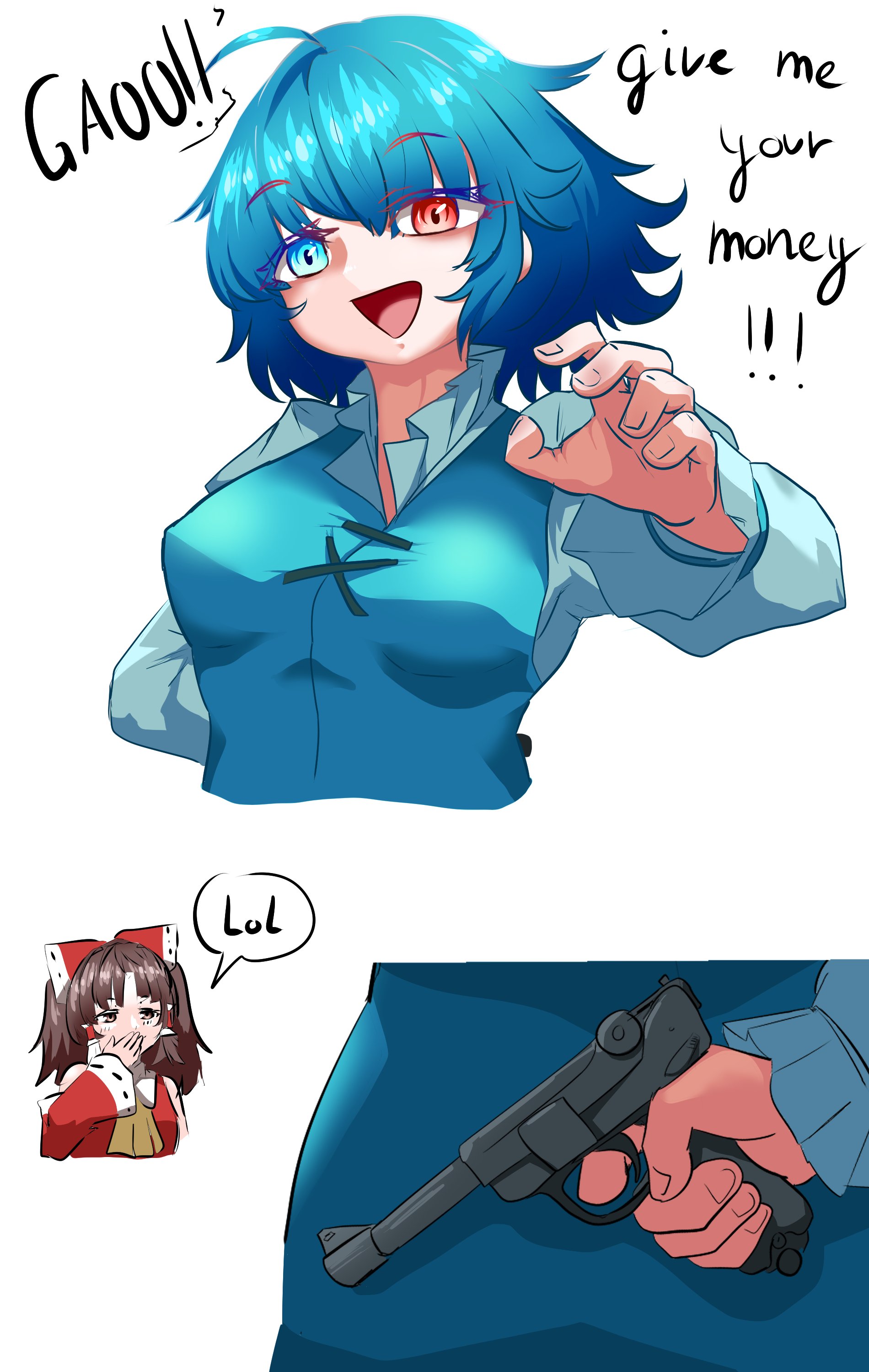 2girls :d absurdres blue_eyes blue_hair breasts cross-laced_clothes einzeilhandery english_text gun hakurei_reimu handgun heterochromia highres holding holding_gun holding_weapon impending_doom luger_p08 medium_breasts multiple_girls open_mouth red_eyes short_hair simple_background smile speech_bubble tatara_kogasa touhou weapon white_background