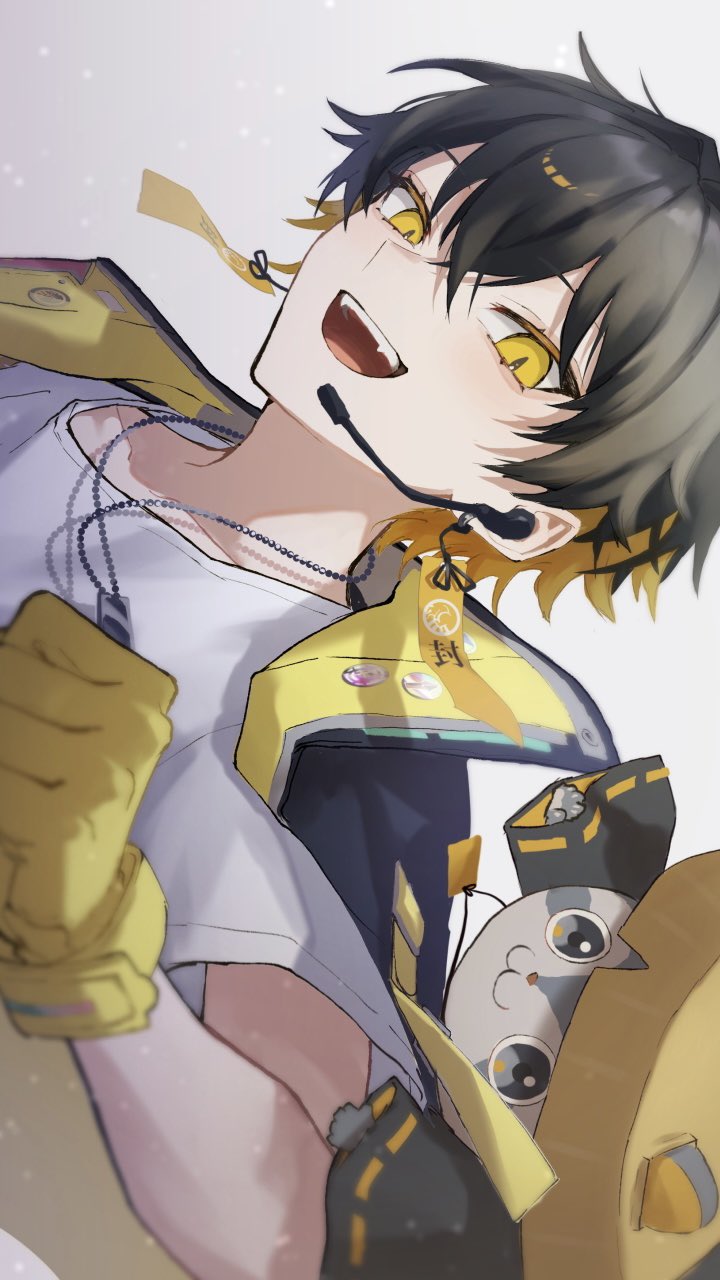 1boy :d animal animal_on_shoulder badge black_hair black_jacket blonde_hair button_badge clenched_hand clothed_animal crossed_bangs dog_tags earpiece earrings fangs gloves hair_between_eyes hand_up highres holostars jacket jacket_on_shoulders jewelry kotatsu_(yatogami_fuma) looking_at_viewer male_focus microphone multicolored_hair ochiya_(nkg_oz) official_alternate_costume open_mouth raccoon sandogasa shirt short_hair sideways sideways_glance simple_background smile solo t-shirt teeth two-sided_fabric two-sided_jacket two-tone_hair upper_body upper_teeth_only virtual_youtuber white_background white_shirt yatogami_fuma yellow_eyes yellow_gloves