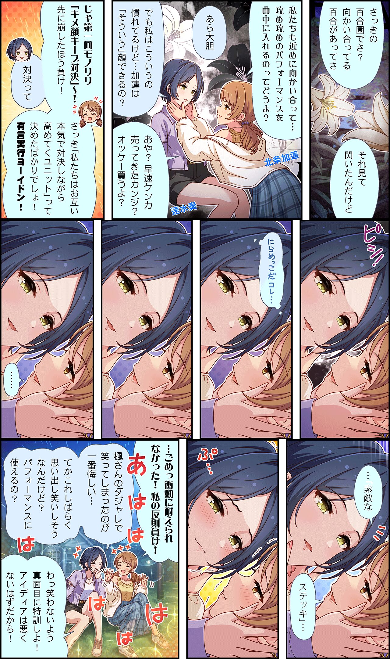 blue_hair cinderella_girls_gekijou comic covering_own_mouth flower hand_over_own_mouth hayami_kanade highres hojo_karen idolmaster idolmaster_cinderella_girls idolmaster_cinderella_girls_starlight_stage japanese_text low_twintails official_art orange_eyes orange_hair short_shorts shorts skirt translation_request twintails yellow_eyes yuri