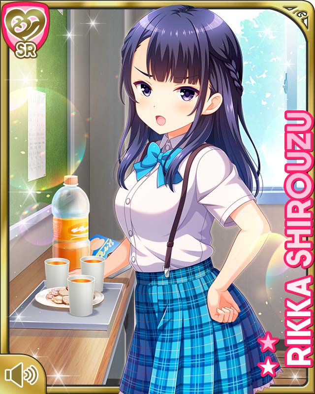 1girl :o black_hair blue_bow blue_skirt bow bowtie braid breasts card_(medium) character_name classroom cup girlfriend_(kari) hand_on_own_hip indoors looking_at_viewer medium_hair official_art open_mouth plaid_clothes plaid_skirt purple_eyes qp:flapper school_uniform shirouzu_rikka shirt shoes skirt small_breasts socks solo standing subspenders tagme uneven_bangs v-shaped_eyebrows white_shirt