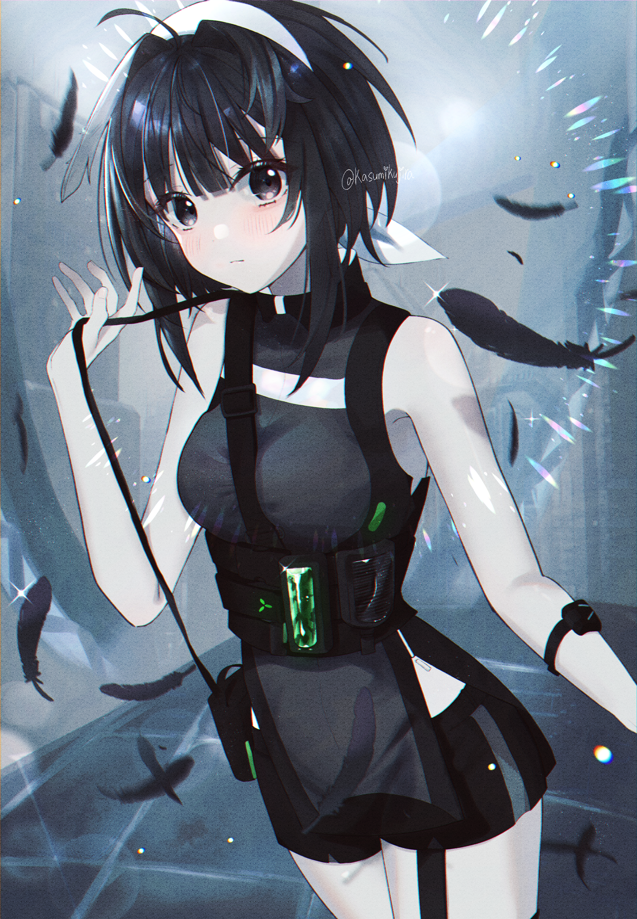 1girl absurdres arknights artist_name bare_shoulders black_eyes black_feathers black_hair breasts clip_studio_paint_(medium) feather_hair feathers hairband highres kasumi_kujira la_pluma_(arknights) looking_at_viewer medium_breasts shorts solo standing white_hairband