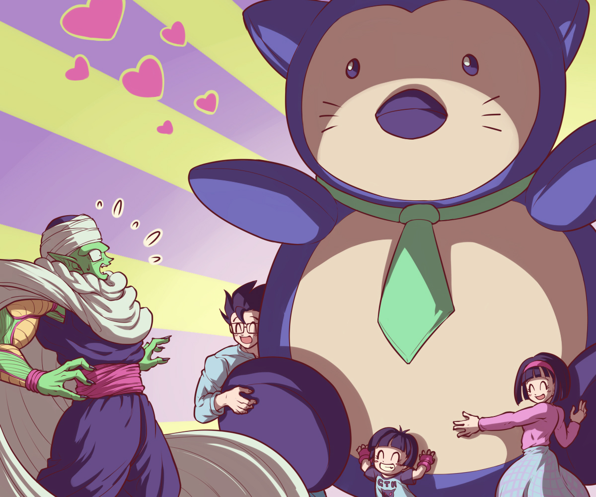 2boys 2girls :d ^_^ arms_up biceps black_hair black_nails blue_shirt blue_skirt blunt_bangs blush cape child closed_eyes colored_skin commentary_request dougi dragon_ball dragon_ball_super dragon_ball_super_super_hero father_and_child father_and_daughter fingerless_gloves fingernails flying_sweatdrops glasses gloves green_background green_skin grin hairband heart holding holding_stuffed_toy hugging_object husband_and_wife koukyouji long_sleeves mother_and_child mother_and_daughter multiple_boys multiple_girls muscular muscular_male namekian open_mouth oversized_object pan_(dragon_ball) pants parent_and_child piccolo pointy_ears print_shirt purple_background purple_gloves purple_hairband purple_pants purple_sash purple_shirt rectangular_eyewear sash shirt short_sleeves shoulder_pads simple_background skirt smile son_gohan spiked_hair stuffed_animal stuffed_toy sweatdrop t-shirt teeth turban two-tone_background videl white_cape wide-eyed