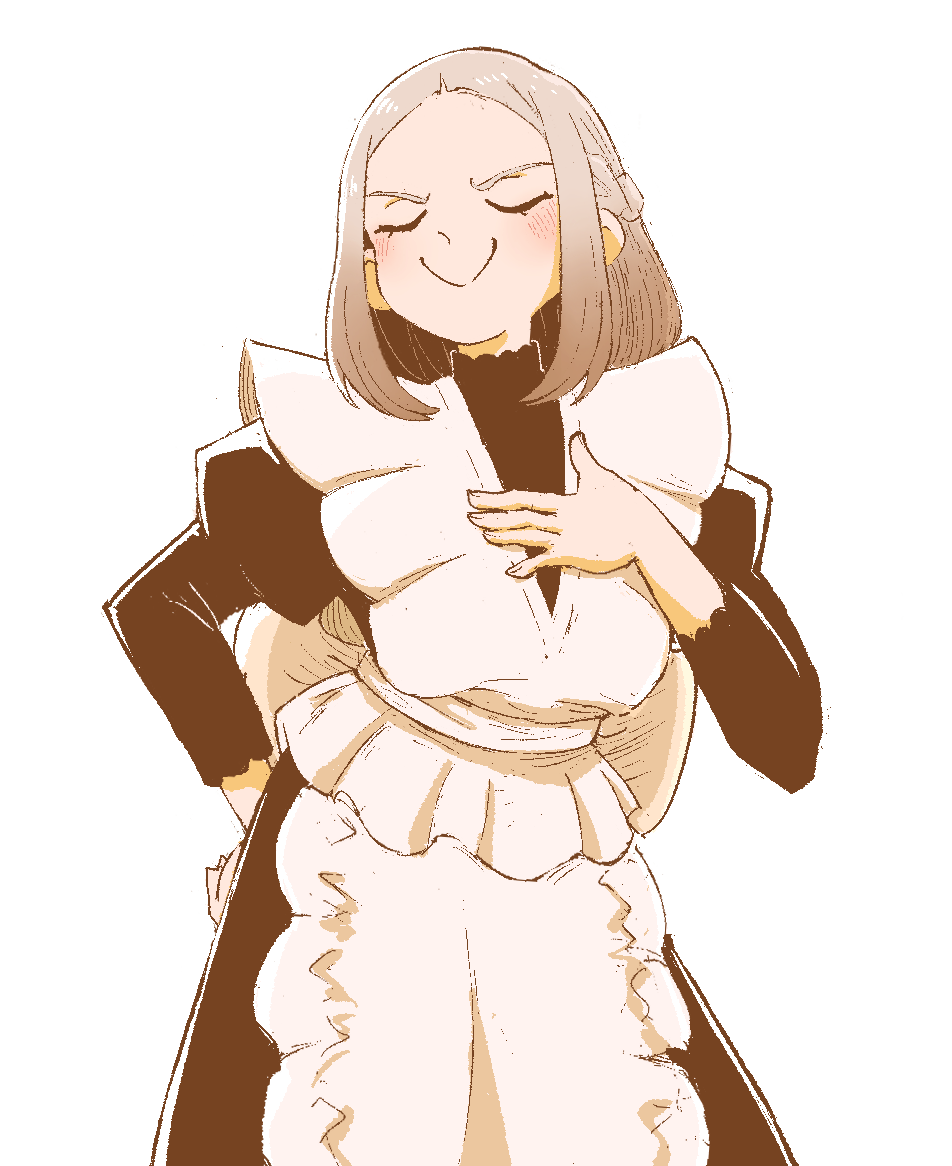 1girl apron black_dress braid brown_hair closed_eyes dress facing_viewer hand_on_own_hip hand_up kimi_no_koto_ga_dai_dai_dai_dai_daisuki_na_100-nin_no_kanojo long_sleeves maid_apron medium_hair meido_mai patti_pattii simple_background smile solo standing white_background