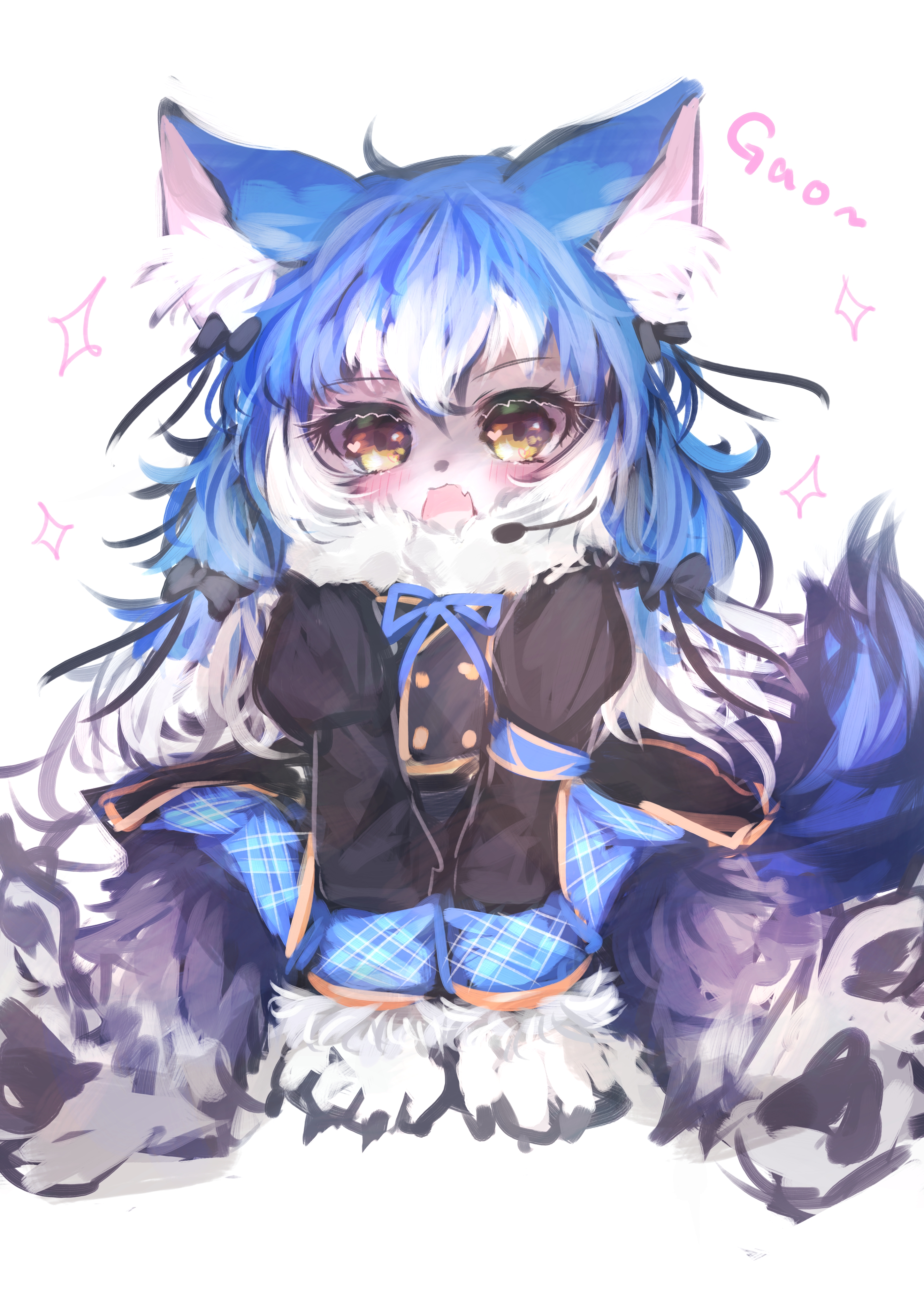 1girl absurdres animal_ear_fluff animal_ears blazer blue_hair bow bowtie dire_wolf_(kemono_friends) extra_ears full_body highres jacket kemono_friends kemono_friends_v_project long_hair looking_at_viewer maki_gamin microphone ribbon scarf simple_background skirt solo tail twintails virtual_youtuber wolf_ears wolf_girl wolf_tail yellow_eyes