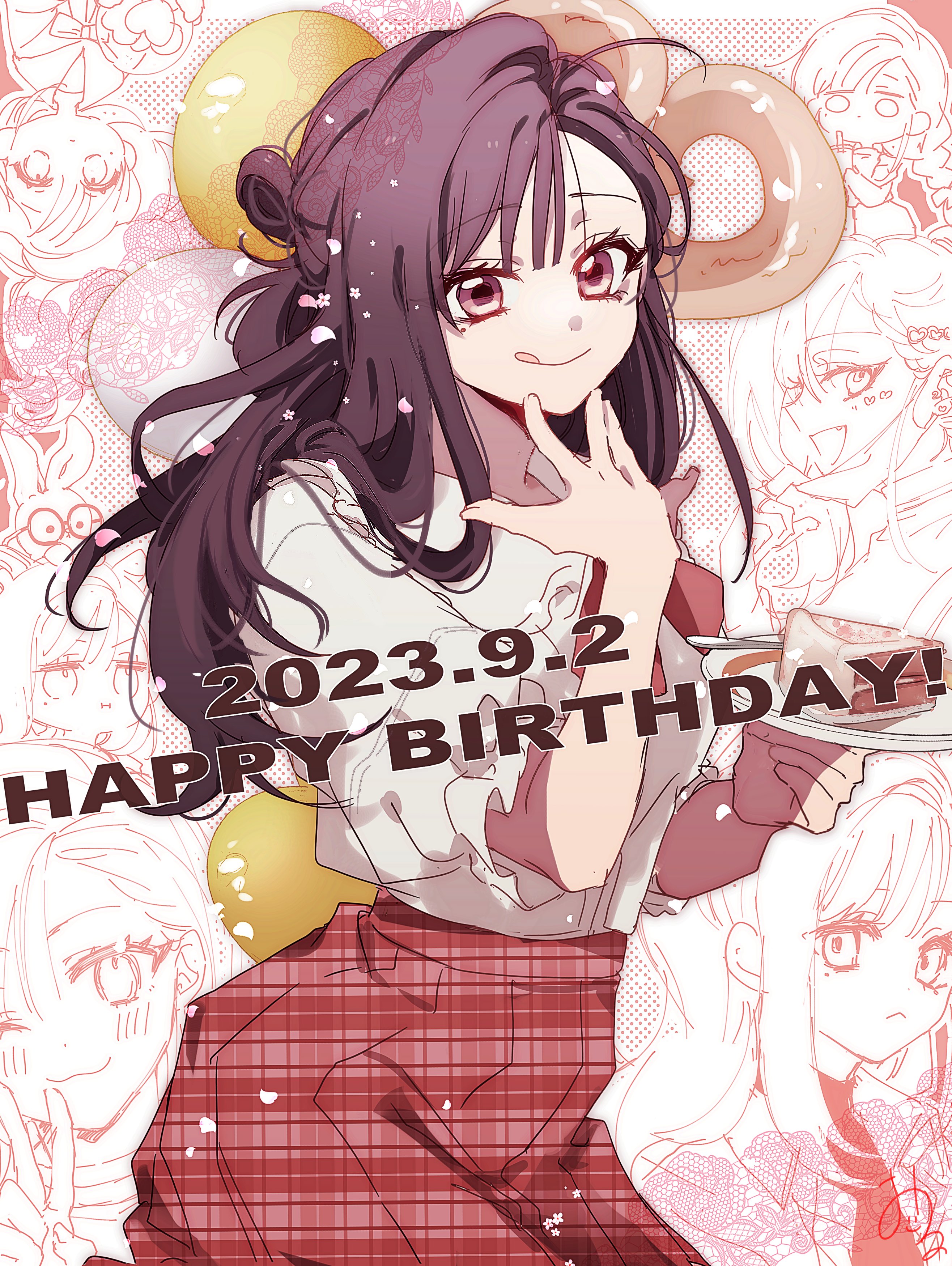 1girl 2023 absurdres balloon dated hair_bun half_updo happy_birthday highres kao_ru05 kashiki_yuno long_hair milgram multicolored_background pink_background pink_eyes plaid_clothes plaid_skirt purple_hair red_skirt shirt short_sleeves signature sketch_background skirt solo white_background white_shirt