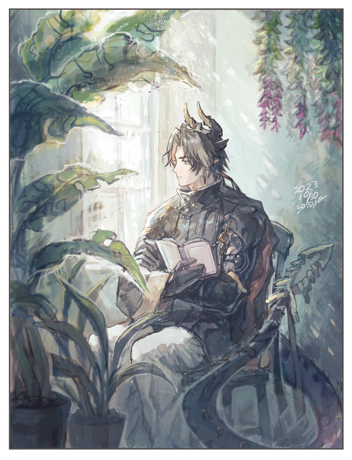 1boy arknights black_jacket black_skin book border brown_hair chair chongyue_(arknights) colored_skin dated dragon_boy dragon_horns dragon_tail feet_out_of_frame hanging_plant holding holding_book horns indoors jacket looking_to_the_side male_focus oisyox72 open_book pants parted_bangs plant potted_plant red_eyes signature sitting solo tail white_pants window