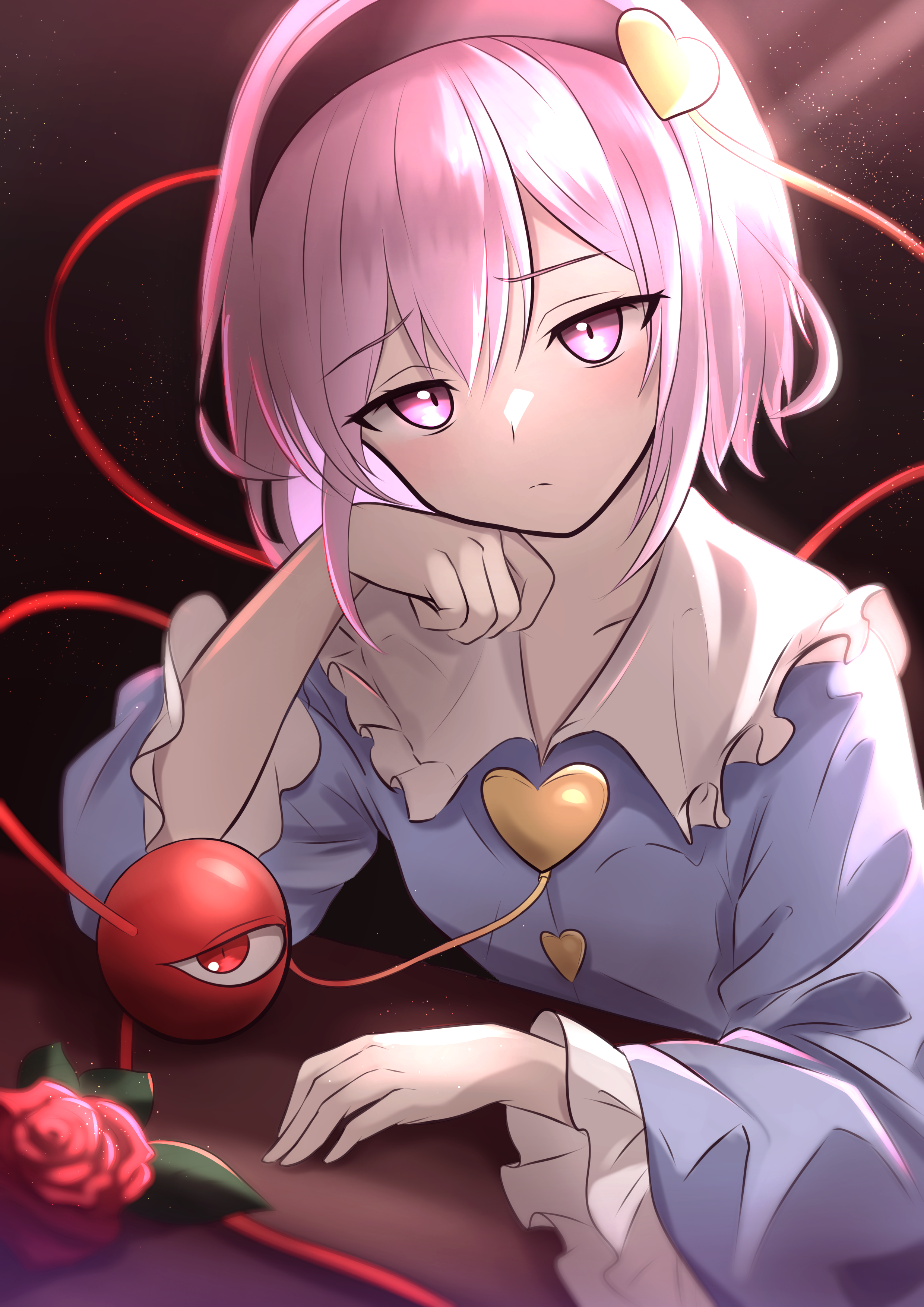 1girl absurdres black_hairband blue_shirt buttons flower frilled_shirt_collar frilled_sleeves frills frown hair_ornament hairband hand_on_own_face heart heart_button heart_hair_ornament highres komeiji_satori long_sleeves looking_at_viewer pink_eyes pink_hair red_eyes red_flower rinkaito1231 rose shirt short_hair third_eye touhou