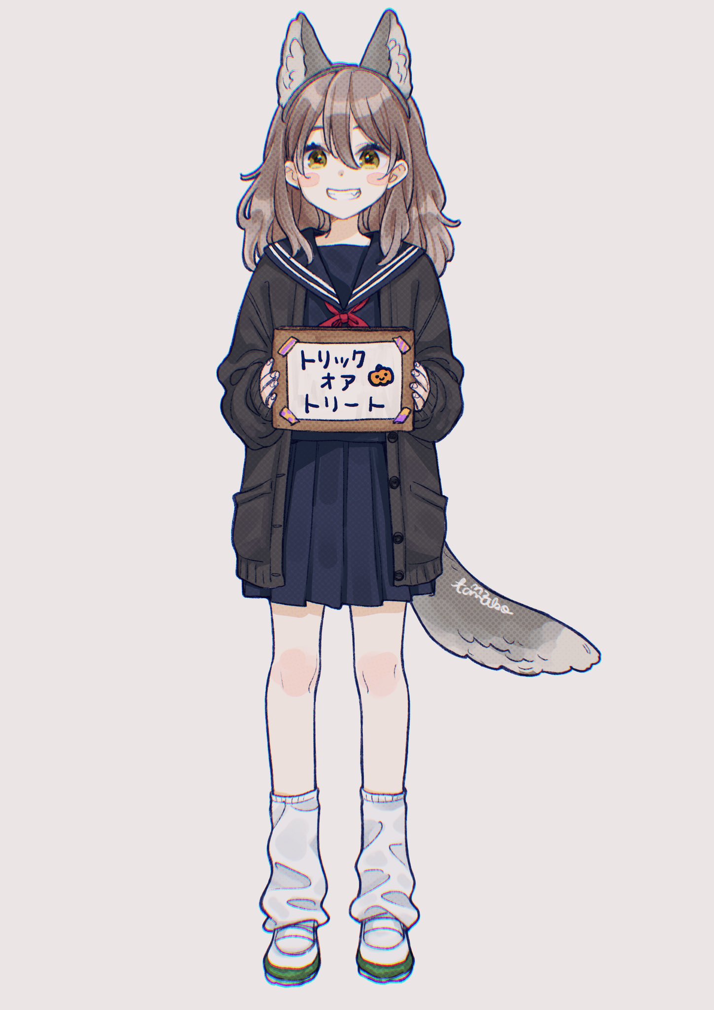 1girl animal_ear_fluff animal_ears black_cardigan black_sailor_collar black_serafuku black_shirt black_skirt blush_stickers brown_eyes brown_hair cardigan full_body grey_background grin hair_between_eyes highres holding long_sleeves loose_socks mizutamako neckerchief open_cardigan open_clothes original pleated_skirt puffy_long_sleeves puffy_sleeves red_neckerchief sailor_collar school_uniform serafuku shirt shoes signature simple_background skirt sleeves_past_wrists smile socks solo standing tail translation_request white_shoes white_socks