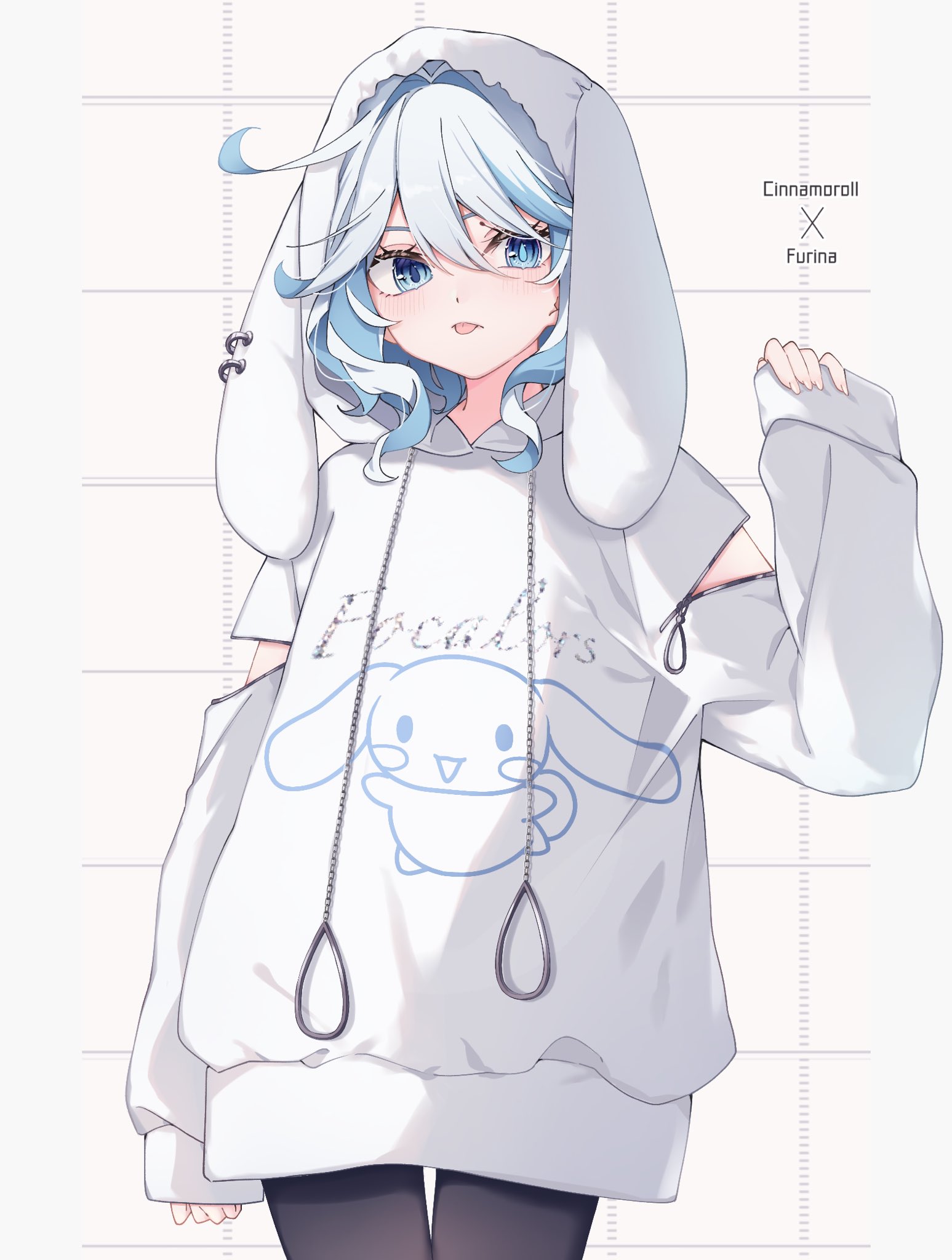 1girl alternate_costume animal_hood black_pantyhose blue_eyes blue_hair cinnamoroll furina_(genshin_impact) fuwa_fuwa_cinnamoroll genshin_impact heterochromia highres hood hood_up hoodie long_sleeves looking_at_viewer mismatched_pupils multicolored_hair pantyhose pomepome1207 rabbit_hood sanrio solo tongue tongue_out white_background white_hair white_hoodie