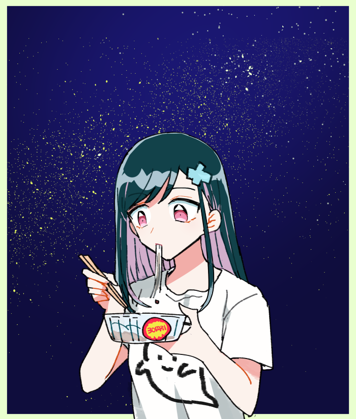 1girl amami_(yuri_espoir) chopsticks commentary_request food ghost_print green_hair hair_ornament holding holding_chopsticks holding_food long_hair naoi_mai noodles official_art pink_eyes ramen shirt sidelocks star_(symbol) star_symbol_background tanabata white_shirt yuri_de_naru_esupowaru