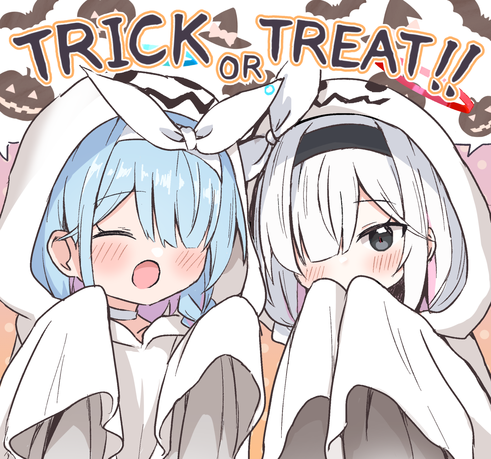 2girls arona_(blue_archive) black_eyes black_hairband blue_archive blue_hair blush closed_eyes colored_inner_hair english_text ghost_costume hachikari_(hachi_karintou) hair_over_one_eye hairband halloween halloween_costume highres long_hair multicolored_hair multiple_girls open_mouth pink_hair plana_(blue_archive) short_hair smile trick_or_treat white_hair
