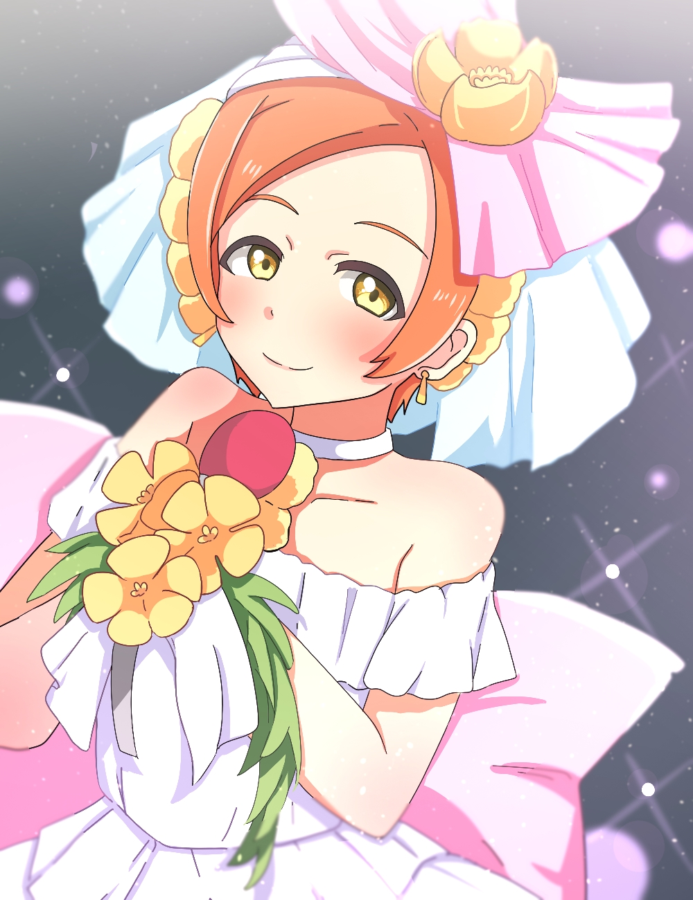 1girl bare_shoulders dress highres hoshizora_rin kametora02 looking_at_viewer love_live! love_wing_bell orange_hair solo yellow_eyes