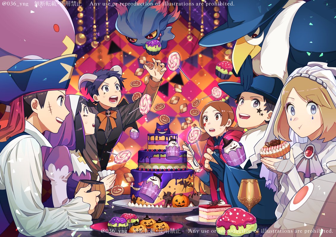 3boys 3girls :t alternate_costume arm_up bird blonde_hair blue_headwear blue_vest blurry brendan_(pokemon) brown_hair cake candy closed_mouth dawn_(pokemon) dress drifblim eating ethan_(pokemon) eyelashes food gen_1_pokemon gen_2_pokemon gen_4_pokemon gengar hat holding honchkrow horns lollipop long_sleeves lucas_(pokemon) lyra_(pokemon) may_(pokemon) misdreavus multiple_boys multiple_girls nintendo open_mouth pokemon pokemon_(creature) pokemon_diamond/pearl/platinum pokemon_heartgold_and_soulsilver pokemon_omega_ruby_and_alpha_sapphire scar scar_on_face shirt short_hair sparkle teeth tongue twintails twitter_username vest watermark white_shirt y_(nekoyanagi)