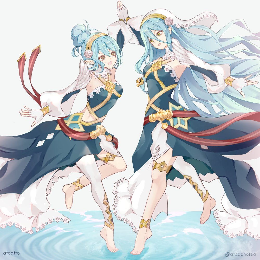 2girls alternate_costume anklet atoatto azura_(fire_emblem) azura_(resplendent)_(fire_emblem) barefoot blue_dress blue_hair breasts detached_sleeves dress female_kana_(fire_emblem) fingerless_gloves fire_emblem fire_emblem_fates fire_emblem_heroes flower gloves hair_bun hair_flower hair_ornament hairband jewelry light_blue_hair long_hair maid_headdress matching_outfits mother_and_child mother_and_daughter multiple_girls nintendo official_alternate_costume parent_and_child pointy_ears single_bare_leg small_breasts thighlet very_long_hair white_background white_gloves yellow_eyes