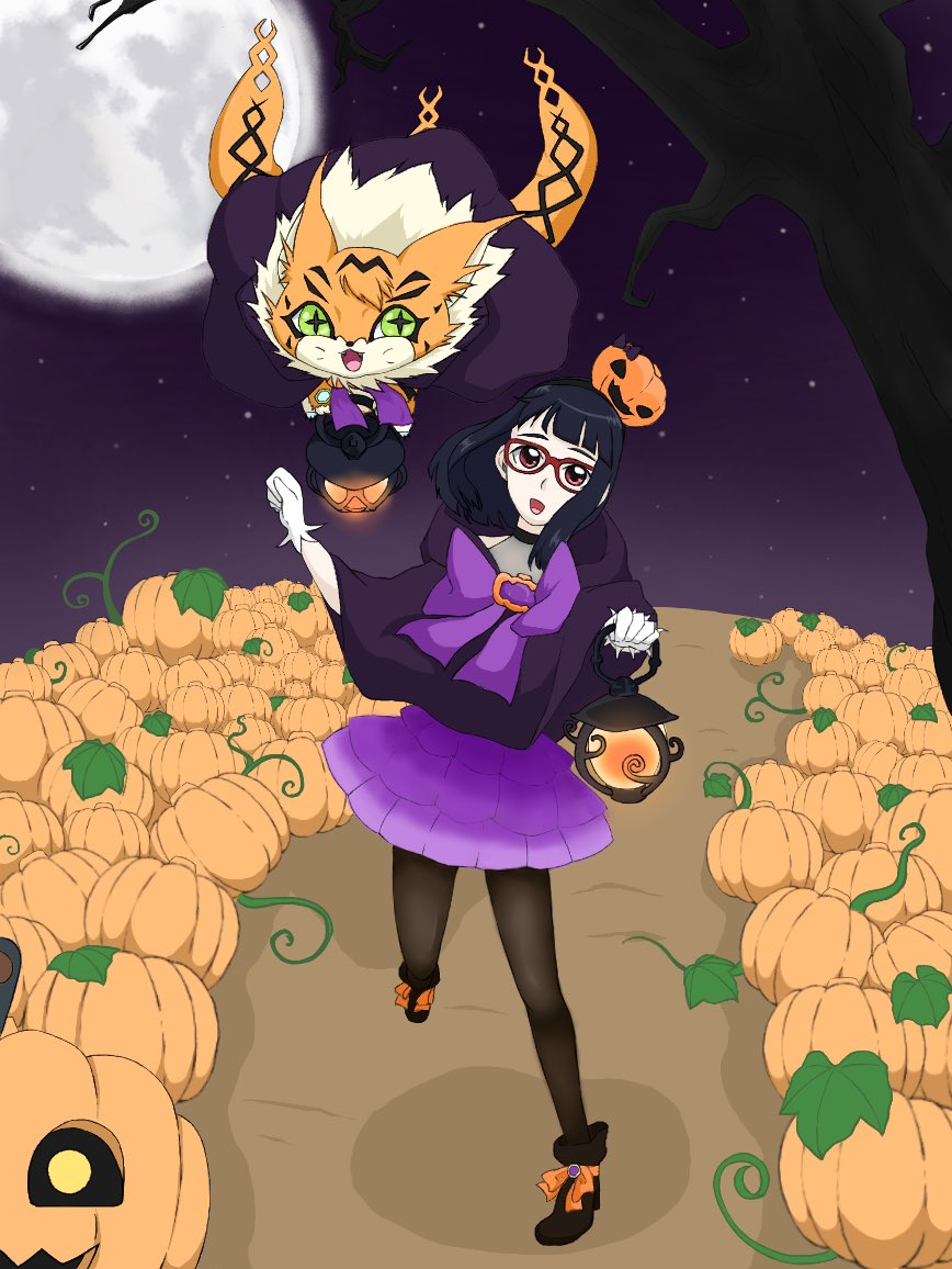 digimon digimon_(creature) halloween halloween_costume looking_at_viewer meicoomon mochizuki_meiko open_mouth pumpmon smile yellow_eyes