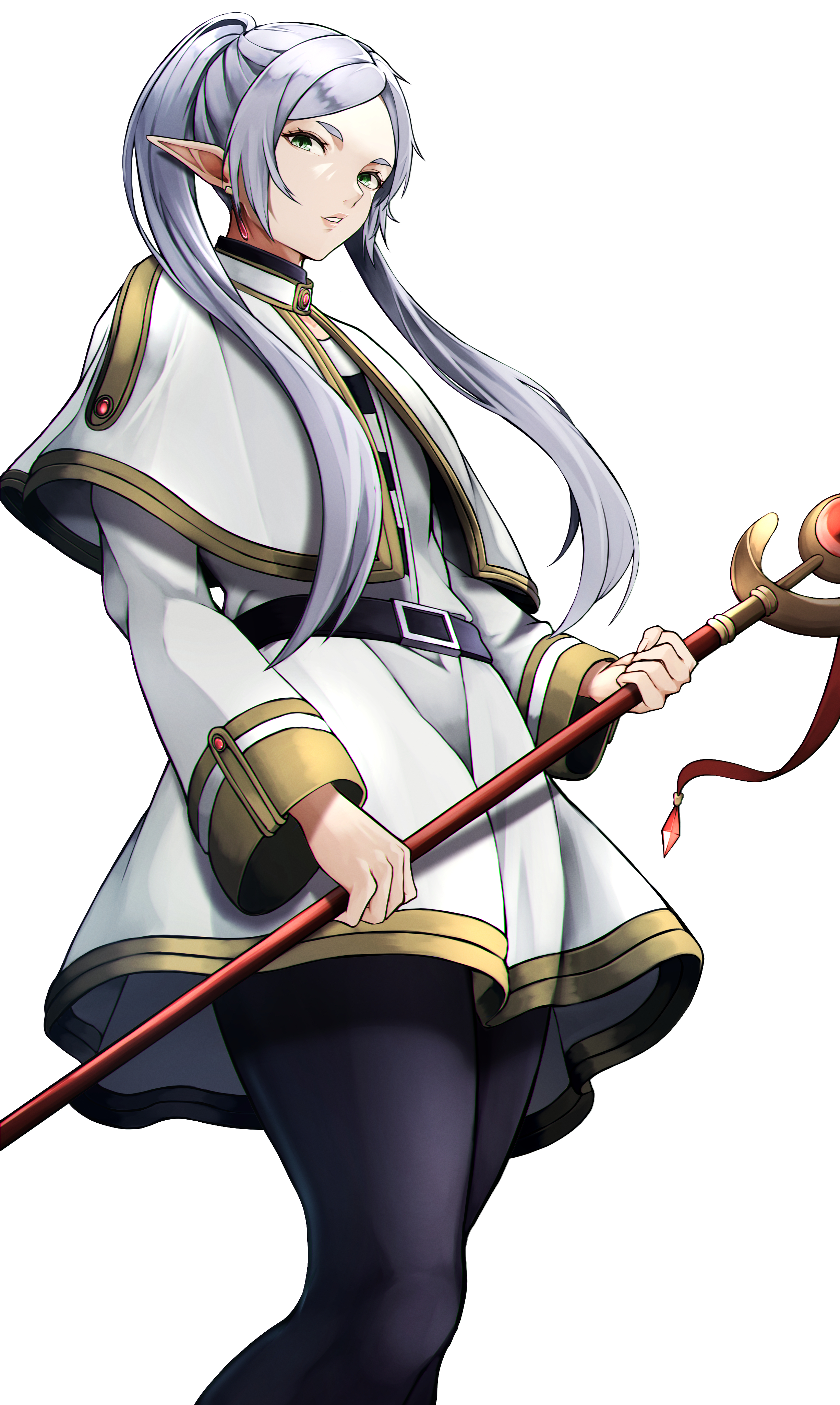 1girl absurdres belt black_belt capelet earrings elf frieren green_eyes highres holding holding_staff jewelry long_hair looking_at_viewer looking_to_the_side pointy_ears simple_background skirt solo souma_(so_u_maaaaa) sousou_no_frieren staff standing twintails white_background white_capelet white_skirt