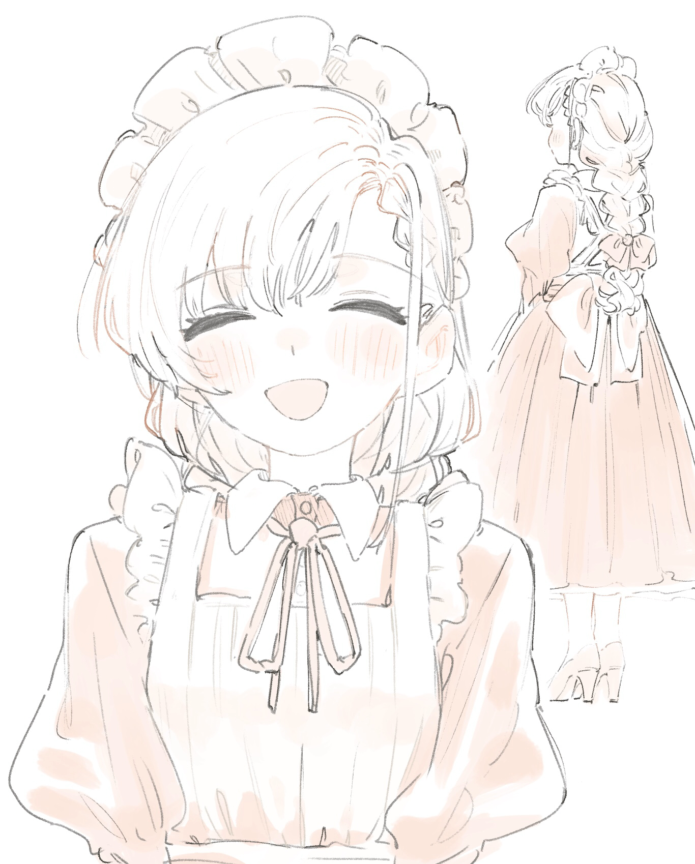 1girl alternate_costume apron back_bow blush bow braid closed_eyes commentary_request dress enmaided frills from_behind full_body hair_ribbon high_heels highres hisakawa_hayate idolmaster idolmaster_cinderella_girls long_hair maid maid_apron maid_headdress monochrome multiple_views neck_ribbon open_mouth puffy_sleeves ribbon simple_background sketch smile tenohira_(tenoo) upper_body