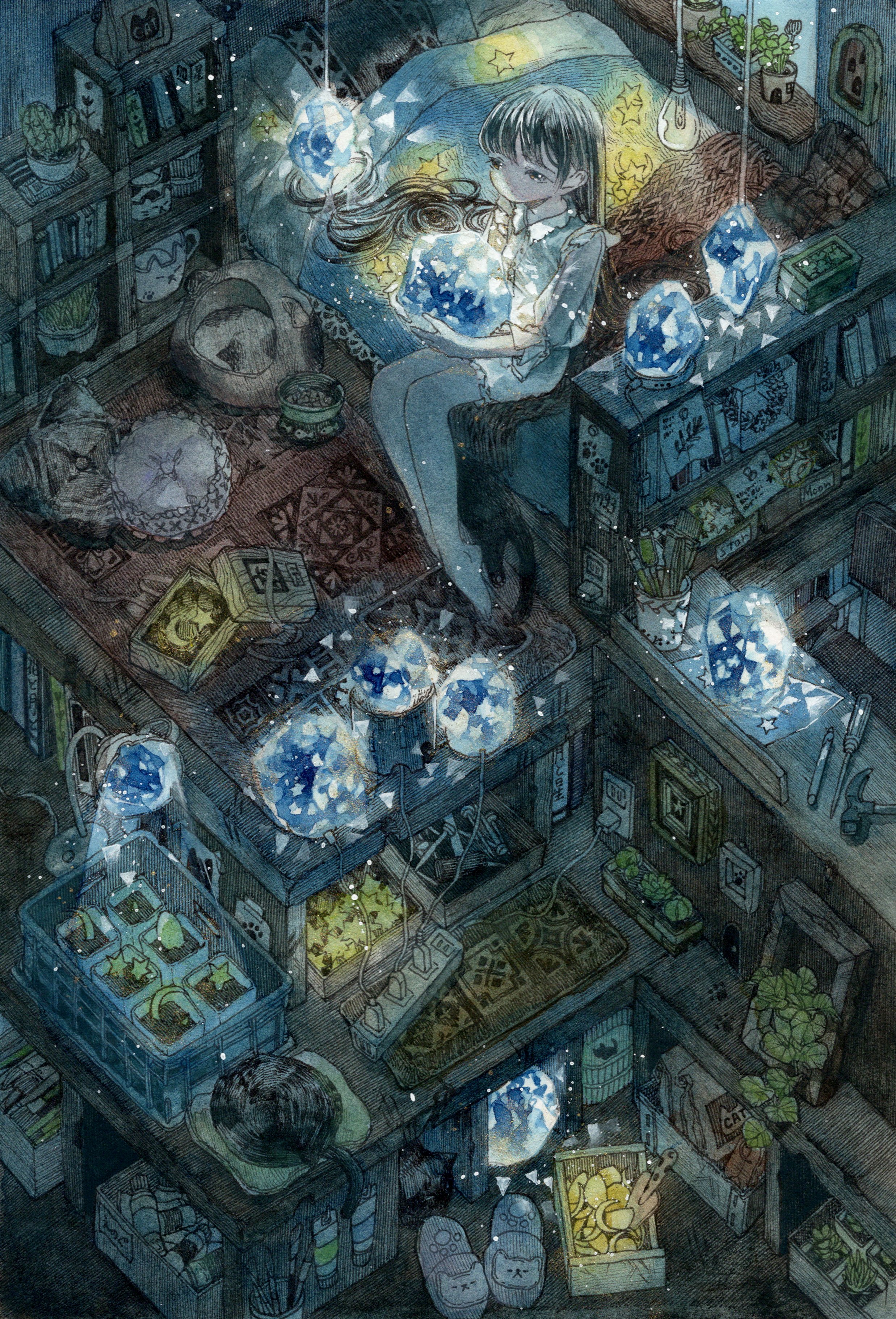 1girl absurdly_detailed_composition absurdres barefoot bed black_cat black_eyes black_hair book bookshelf cactus carpet cat ceiling_light commentary_request electrical_outlet expressionless full_body gem hammer highres indoors light_bulb loaded_interior long_hair megumi_(mg3) original painting_(medium) plant potted_plant power_strip screwdriver shelf sitting slippers solo star_(symbol) traditional_media very_long_hair watercolor_(medium)