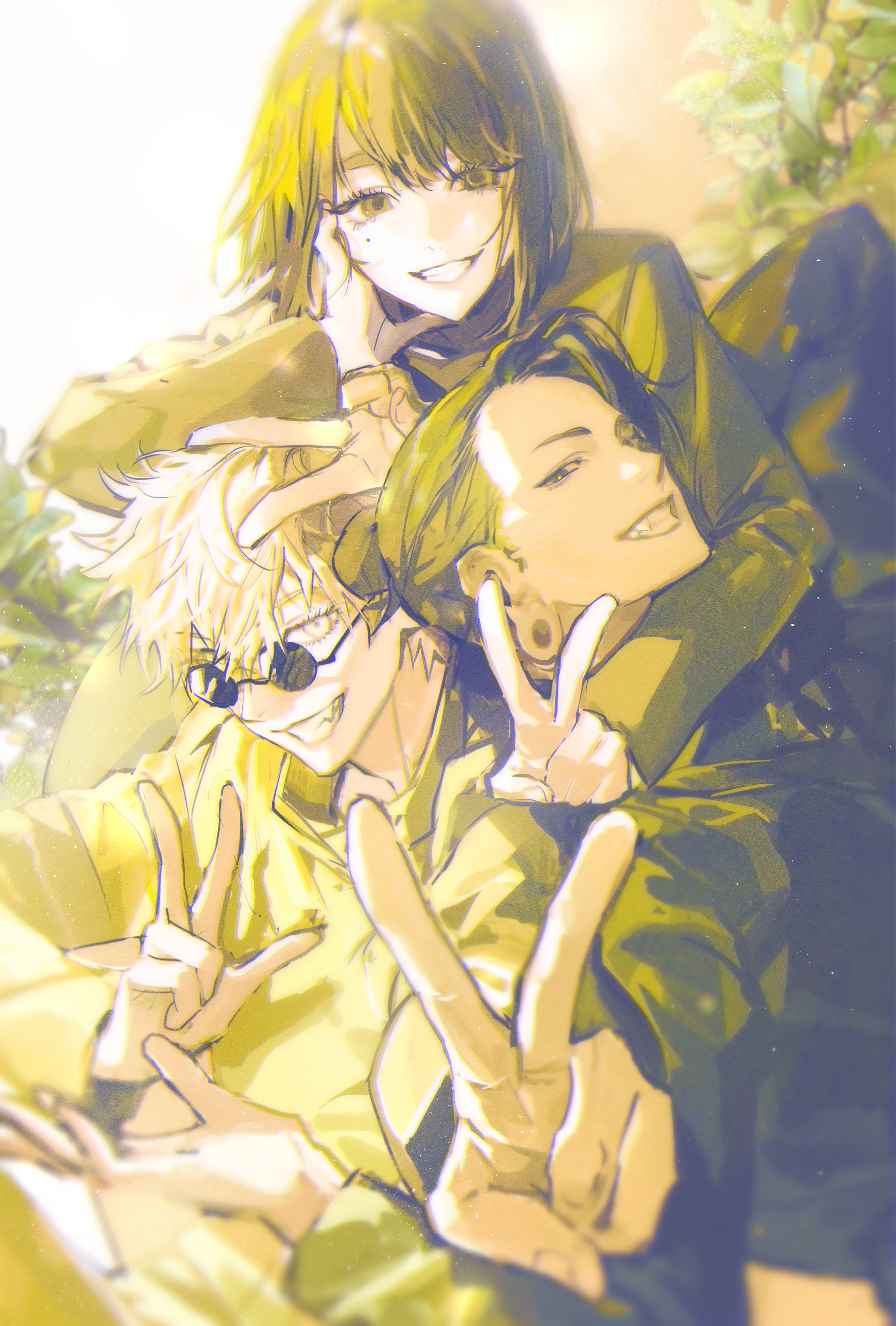 1girl 2boys absurdres ear_piercing geto_suguru gojo_satoru grin hair_bun hair_pulled_back hand_up hands_up head_rest highres ieiri_shoko jacket jujutsu_kaisen jujutsu_tech_uniform long_sleeves looking_at_viewer mgmg_1012 mole mole_under_eye monochrome multiple_boys piercing round_eyewear school_uniform short_hair smile sunglasses teeth upper_body v