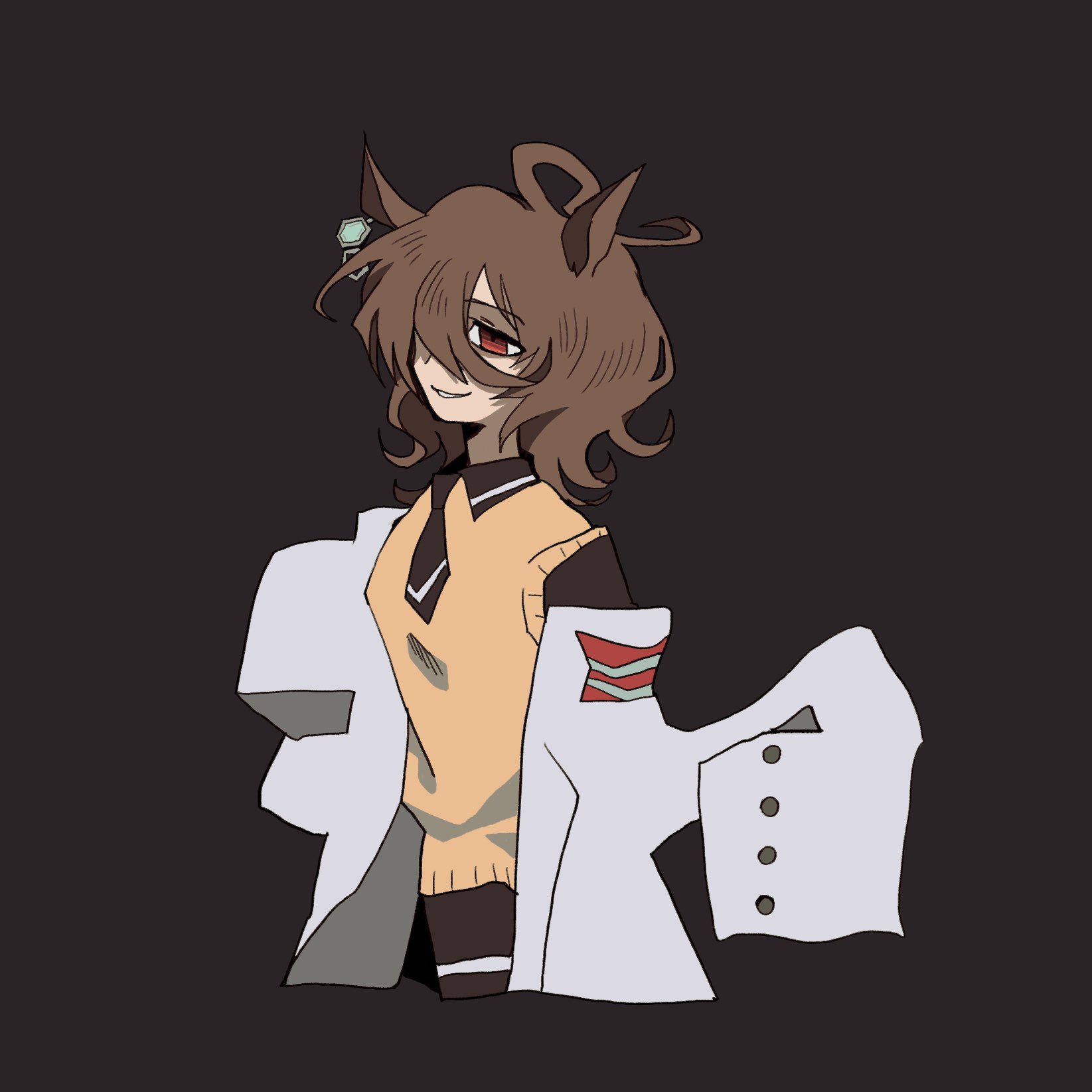 1girl agnes_tachyon_(tach-nology)_(umamusume) agnes_tachyon_(umamusume) ahoge animal_ear_piercing animal_ears brown_background brown_hair brown_necktie brown_sweater_vest chidori_(penguin_matsuno) coat collared_shirt cropped_torso earrings grin hair_between_eyes hair_over_one_eye half-closed_eyes highres horse_ears horse_girl jewelry lab_coat long_bangs long_sleeves looking_ahead medium_hair necktie off_shoulder one_eye_covered open_clothes open_coat red_eyes shirt simple_background single_earring sleeves_past_fingers sleeves_past_wrists smile solo sweater_vest umamusume