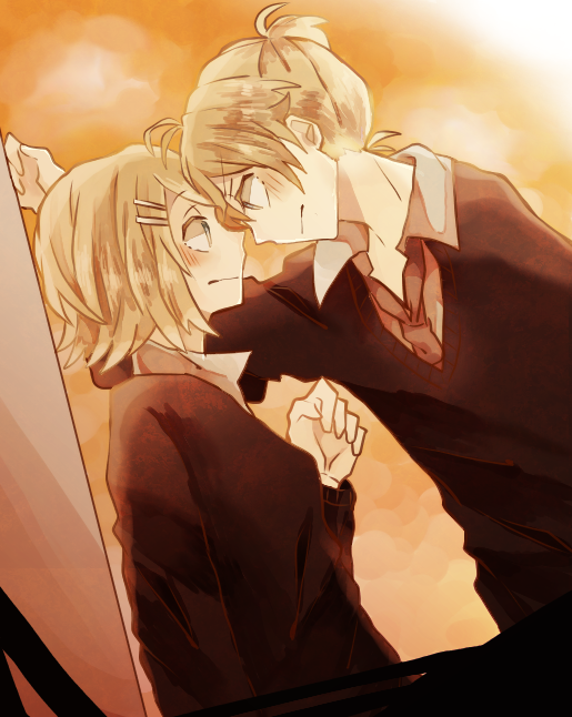 1boy 1girl against_wall alternate_costume aqua_eyes black_sweater blonde_hair blush closed_mouth collared_shirt commentary dutch_angle embarrassed eye_contact face-to-face from_side grey_necktie hair_ornament hairclip hetero kabedon kagamine_len kagamine_rin long_sleeves looking_at_another maka_(lovelenrin) necktie no_hairband orange_background ponytail profile school_uniform shirt short_hair short_ponytail sweater upper_body v-neck vocaloid white_shirt