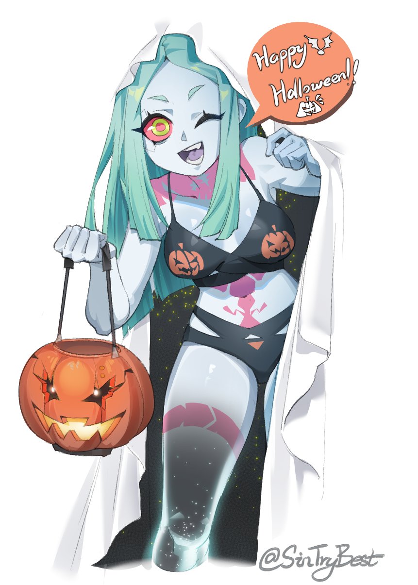 1girl bat_(animal) bikini blue_hair colored_sclera cyberpunk_(series) cyberpunk:_edgerunners english_text ghost_costume green_eyes halloween halloween_bucket highres one_eye_closed open_mouth pumpkin rebecca_(cyberpunk) red_sclera signature sin_(sintrybest) sky smile solo star_(sky) starry_sky swimsuit tank_top tattoo thick_thighs thighs white_background