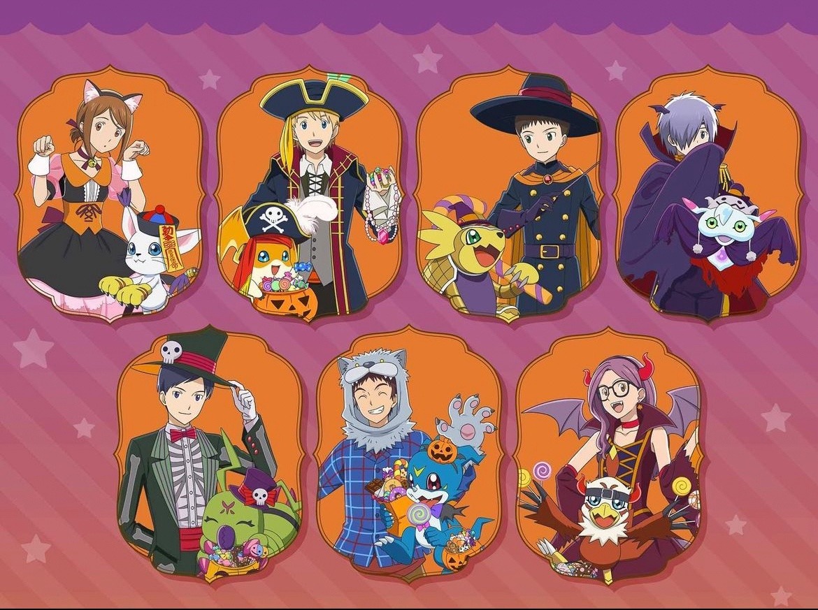2girls 5boys armadillo armadimon bird bug cat digimon digimon_(creature) glasses halloween halloween_bucket halloween_costume hawkmon hida_iori ichijouji_ken inoue_miyako looking_at_viewer motomiya_daisuke multiple_boys multiple_girls owada_rui patamon smile tailmon takaishi_takeru ukkomon v-mon wings wormmon yagami_hikari