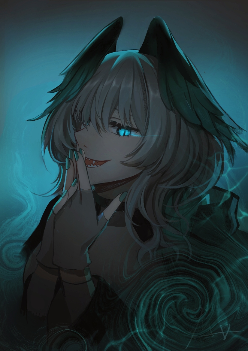 1girl arknights black_feathers black_wings blue_background blue_eyes blue_feathers blue_nails blue_wings commentary covering_own_mouth eye_trail feathered_wings feathers fingerless_gloves gloves glowing glowing_eyes grey_hair hair_between_eyes head_wings ho'olheyak_(arknights) light_trail long_hair long_sleeves looking_at_viewer nail_polish open_mouth qianxiaxiale sharp_teeth slit_pupils solo swirl untranslatable_commentary teeth white_gloves wings