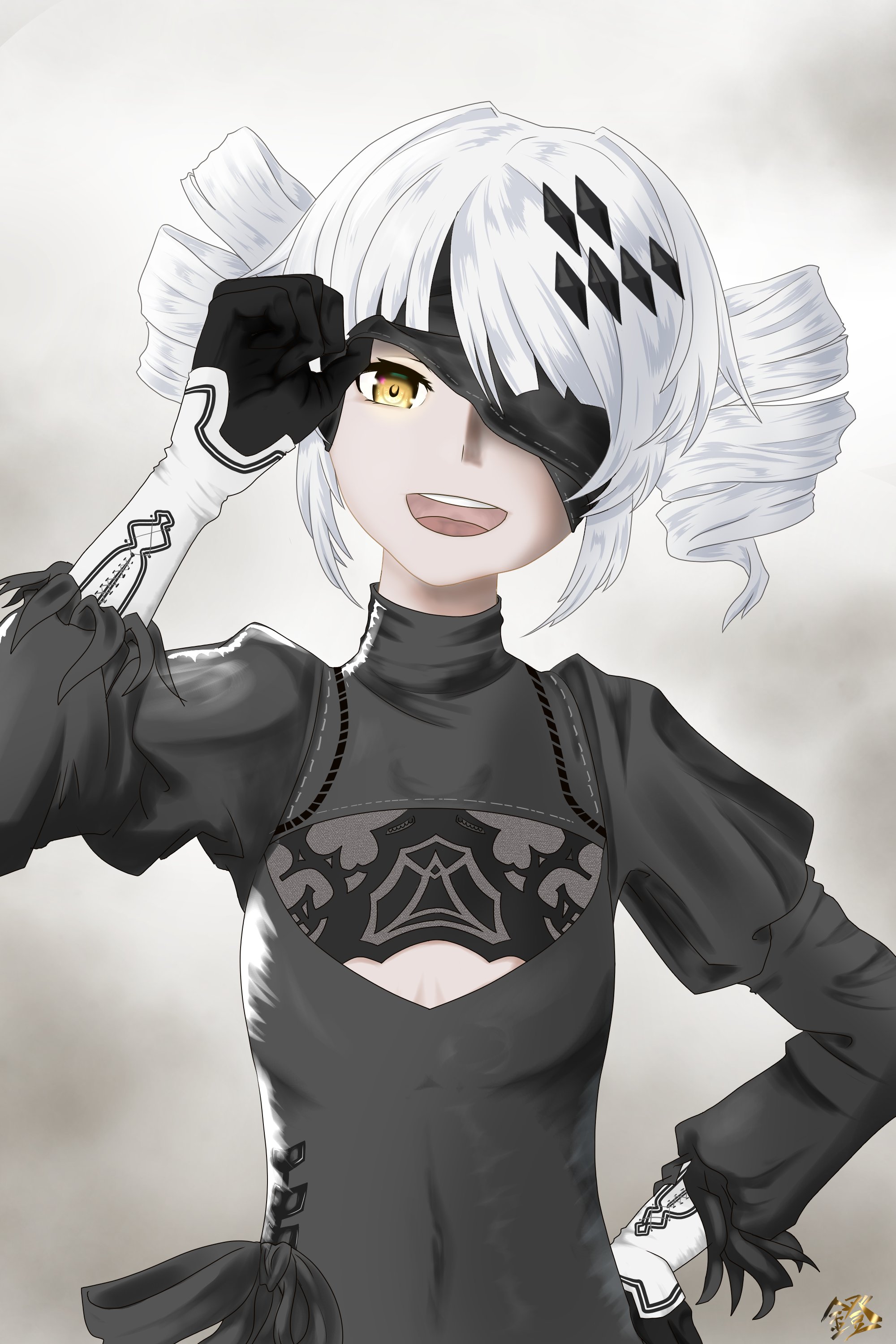 1girl absurdres bandage_over_one_eye black_bandages black_dress black_hair breasts cleavage cosplay dress drill_hair grey_hair highres karenina:_ember_(pgr) karenina_(pgr) long_hair long_sleeves looking_at_viewer nier:automata nier_(series) open_mouth orange_eyes punishing:_gray_raven rusha2197 sidelocks small_breasts solo teeth twin_drills upper_teeth_only