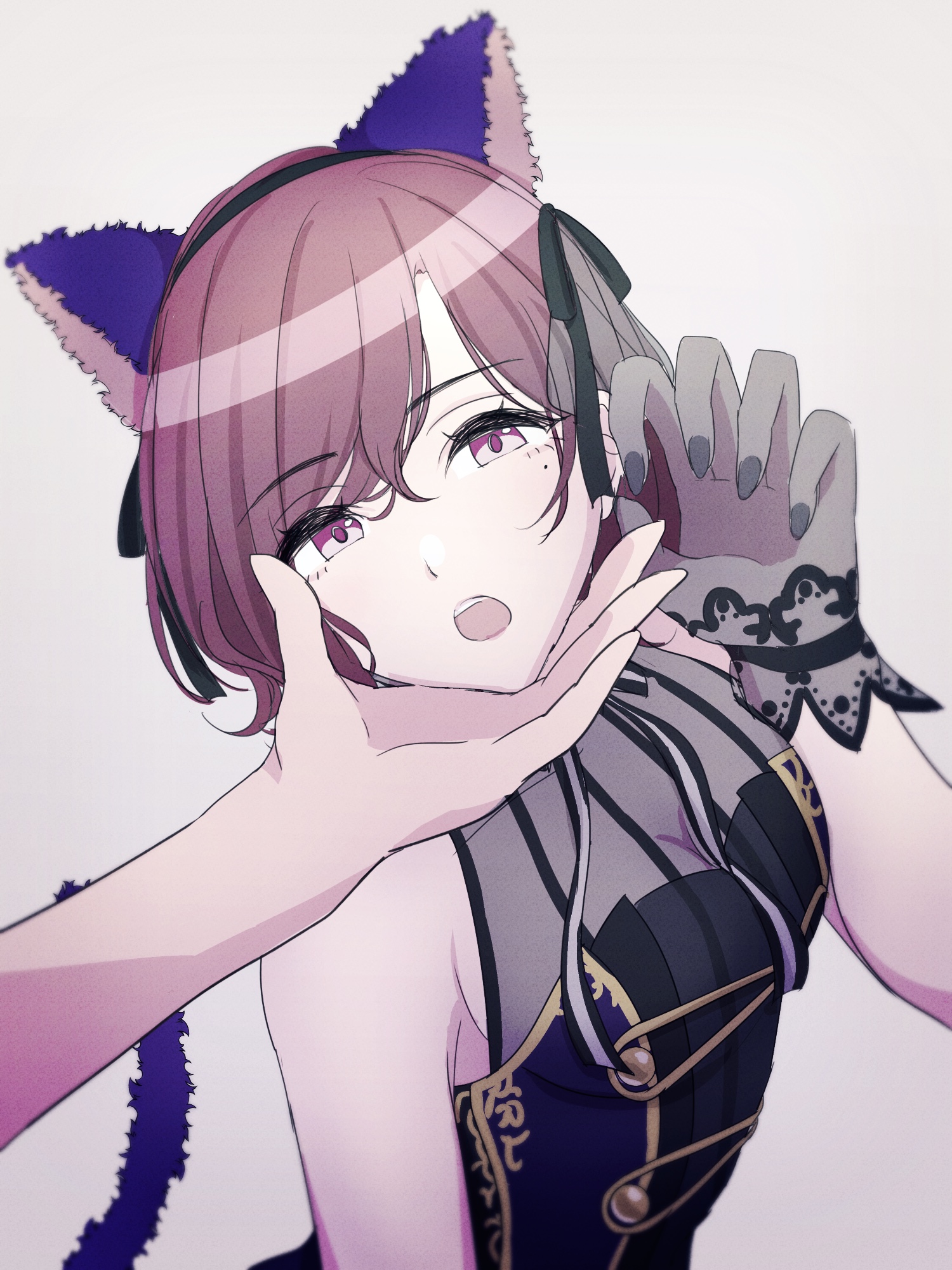 1girl 1other animal_ears arched_back bare_shoulders black_nails breasts cat_ears cat_hair_ornament cat_tail choker claw_pose cleavage corset embroidery eyelashes fake_tail gloves gold_trim hair_ornament hair_ribbon hand_on_another's_chin highres higuchi_madoka idolmaster idolmaster_shiny_colors kakemi lace lace_gloves light_brown_hair lipstick makeup medium_breasts mole mole_under_eye nail_polish open_mouth pink_eyes pink_pupils ribbon ribbon_choker see-through_clothes short_hair sleeveless swept_bangs tail tail_ornament tail_ring two-tone_corset white_background