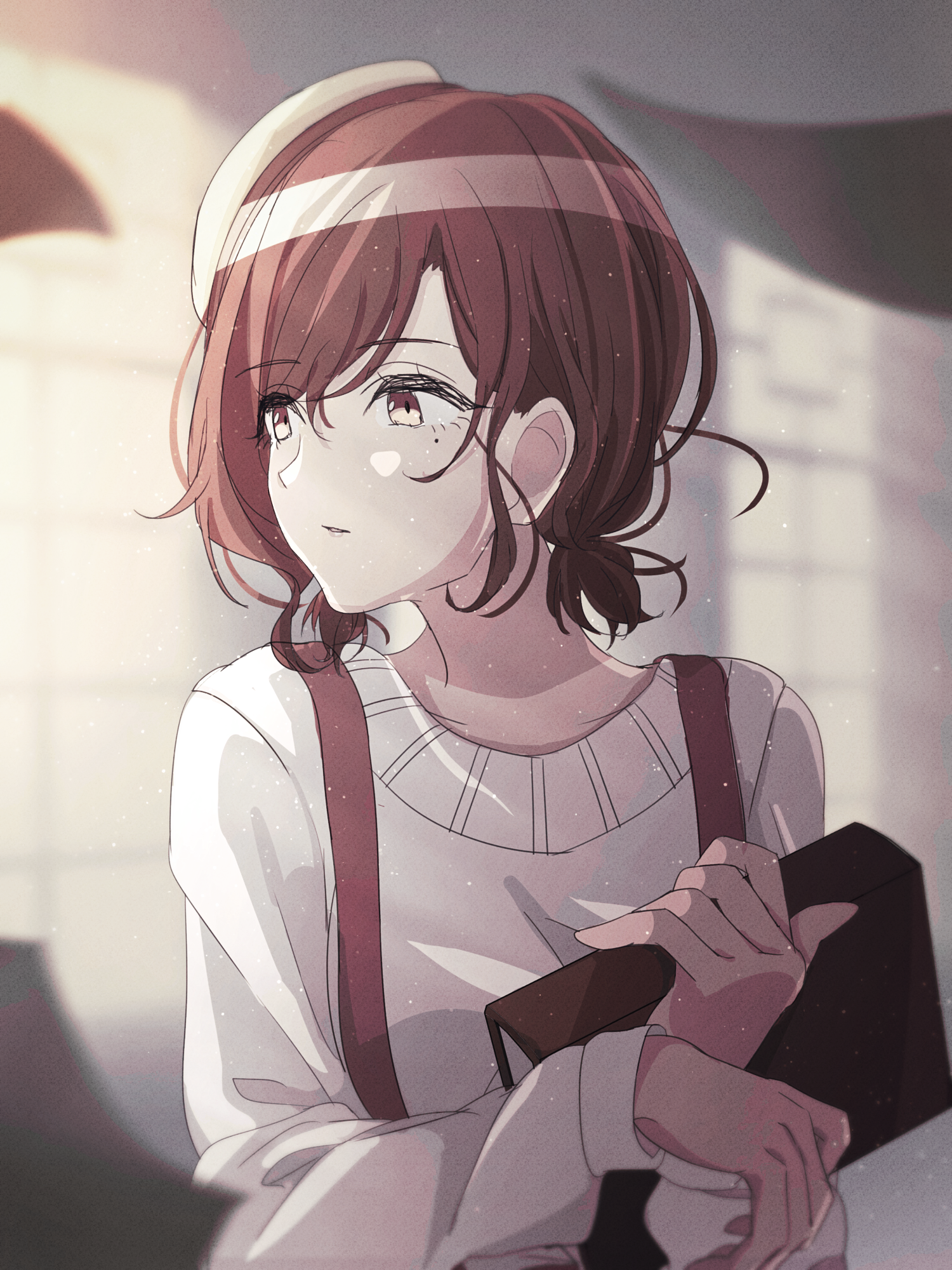 1girl book from_side highres higuchi_madoka holding holding_book idolmaster idolmaster_shiny_colors kakemi light_brown_hair long_sleeves mole mole_under_eye parted_lips short_hair short_twintails suspenders sweater swept_bangs twintails white_headwear white_sweater