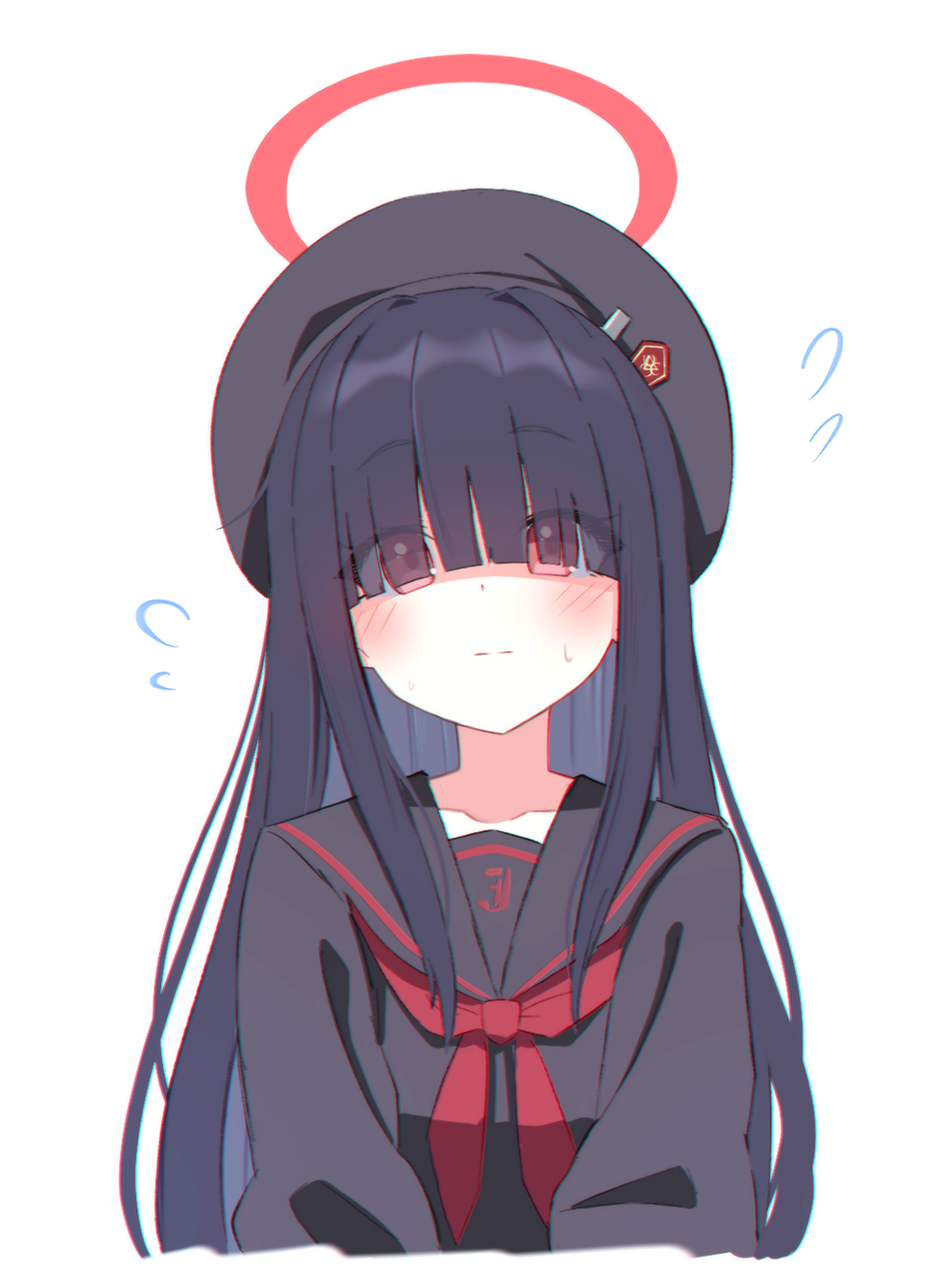 1girl beret black_hair black_hat black_sailor_collar black_serafuku blue_archive blush closed_mouth eyes_visible_through_hair flying_sweatdrops foulo_paints hair_over_eyes halo hat highres justice_task_force_member_(blue_archive) long_hair long_sleeves looking_at_viewer neckerchief red_eyes red_halo red_neckerchief sailor_collar school_uniform serafuku simple_background solo upper_body white_background