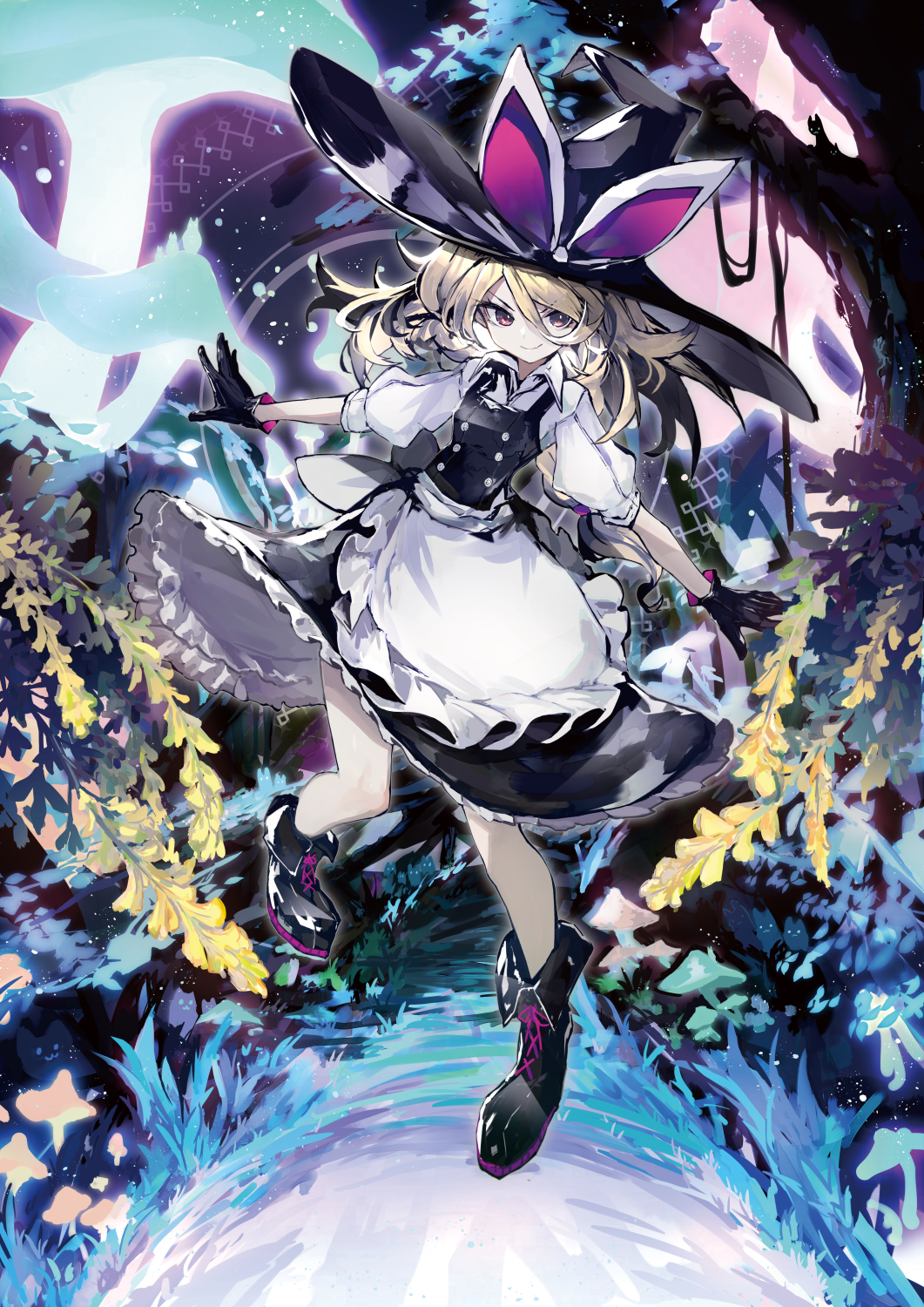 1girl apron black_boots black_gloves black_hat black_skirt black_vest blonde_hair boots collared_shirt frilled_apron frills gloves hair_between_eyes hat highres kirisame_marisa kusakanmuri long_hair puffy_short_sleeves puffy_sleeves red_eyes shirt short_sleeves skirt solo touhou vest waist_apron white_apron white_shirt witch_hat