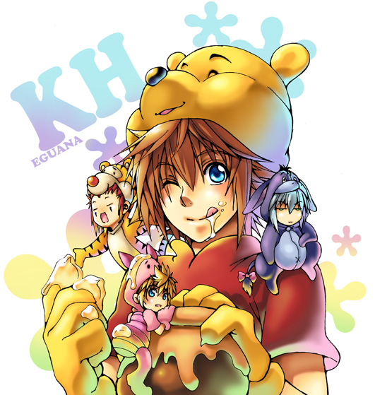 4boys alternate_costume animal_ears arm_on_knee artist_name axel_(kingdom_hearts) blue_eyes chibi chibi_inset chibi_on_shoulder claws commentary cosplay eating eeyore eeyore_(cosplay) eguana elbow_on_knee english_commentary engrish_commentary expressionless facial_mark fake_animal_ears fake_tail floral_background floral_print food food_on_body food_on_face food_on_head gloves holding_honeypot honey honeypot kingdom_hearts kingdom_hearts_ii licking_lips male_focus medium_hair multiple_boys object_on_head one_eye_closed open_mouth outstretched_arm piglet_(winnie_the_pooh) piglet_(winnie_the_pooh)_(cosplay) pooh pooh_(cosplay) rainbow_background red_hair red_shirt riku_(kingdom_hearts) roxas shirt short_hair short_sleeves sitting smile sora_(kingdom_hearts) spiked_hair standing tail tigger tigger_(cosplay) tongue tongue_out white_hair winnie_the_pooh yellow_gloves yellow_headwear