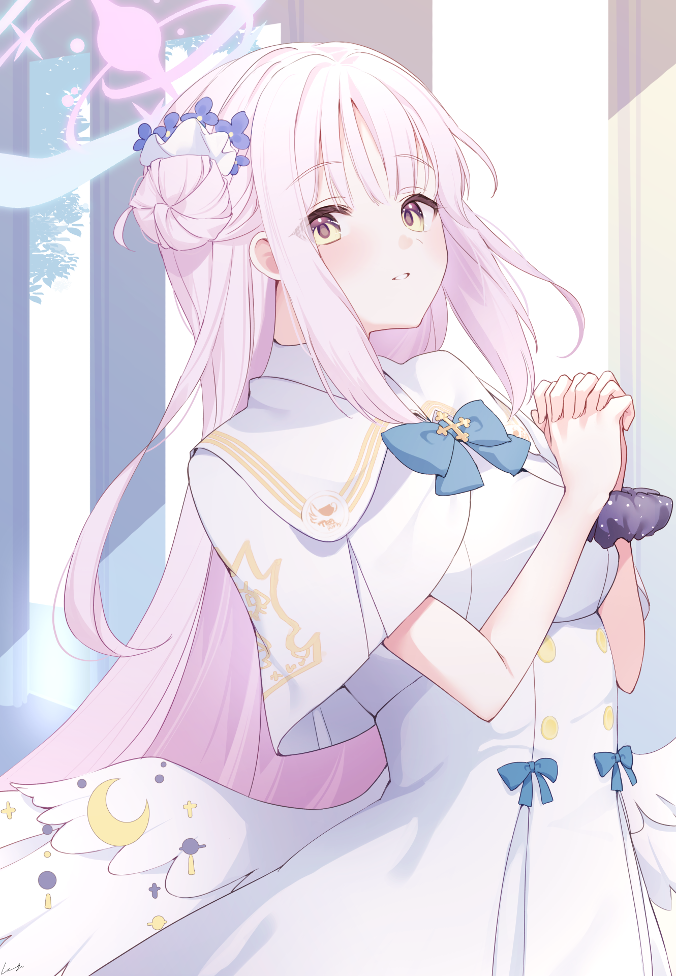 1girl angel_wings blue_archive capelet dress feathered_wings flower hair_bun hair_flower hair_ornament halo highres komatsu_(komatsuu123) long_hair looking_at_viewer mika_(blue_archive) open_mouth pink_hair pink_halo purple_flower single_side_bun solo white_capelet white_dress white_wings wings yellow_eyes