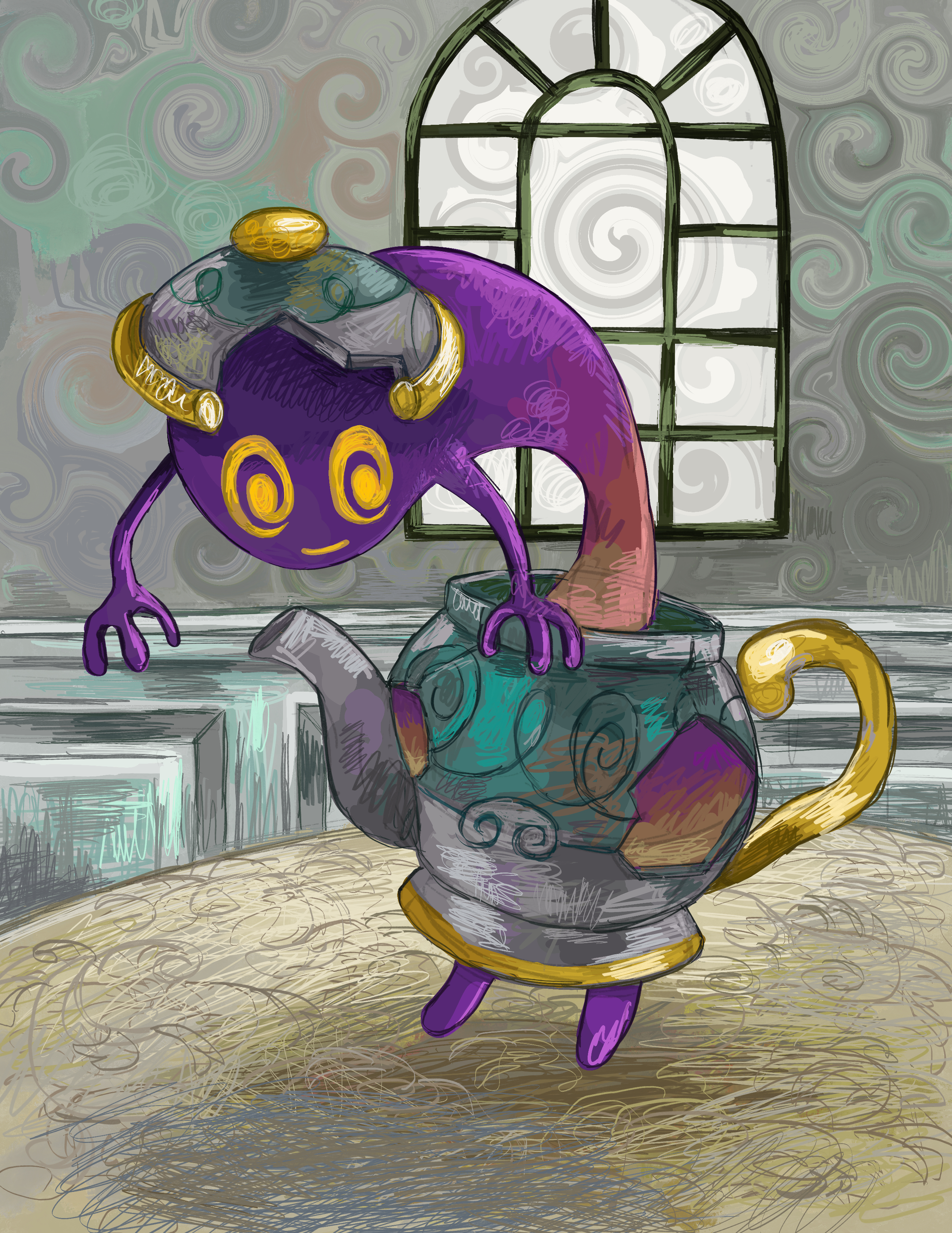 @_@ absurdres broken closed_mouth full_body gen_8_pokemon highres indoors nintendo nishinori_(24no71) no_humans object_on_head on_table pokemon pokemon_(creature) polteageist solo standing table teapot window yellow_eyes