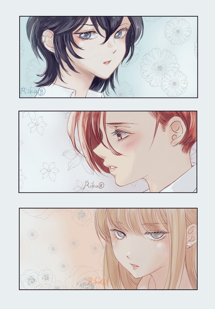 3girls asahina_yuni black_hair blonde_hair blue_eyes floral_background grey_eyes kyou_wa_kanojo_ga_inai_kara light_blush looking_at_viewer looking_to_the_side multiple_girls natsume_nanase open_mouth paneled_background portrait red_eyes red_hair rk8bb signature taki_fuuko white_background