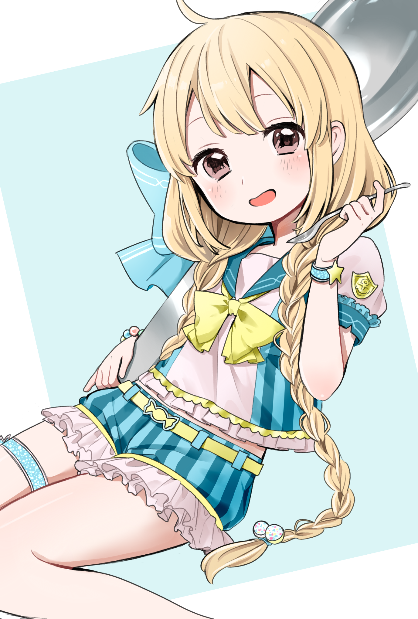 1girl ahoge belt blonde_hair blue_shorts blush bow bowtie braid brown_eyes commentary_request frilled_shorts frills futaba_anzu highres holding holding_spoon idolmaster idolmaster_cinderella_girls long_hair looking_at_viewer open_mouth oversized_object shirt short_shorts short_sleeves shorts sks_(s3_rosquilla) smile solo spoon striped_clothes striped_shirt striped_shorts thigh_strap twin_braids two-tone_background very_long_hair wristband yellow_bow yellow_bowtie