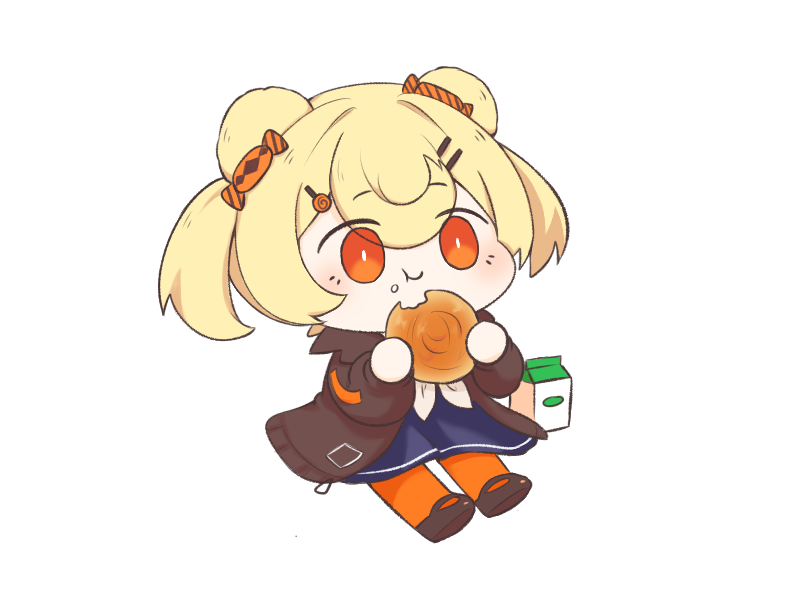 10_(xknn5488) 1girl :t animal_ears arknights bear_ears bear_girl blue_dress blush brown_jacket brown_shoes candy_hair_ornament chibi dress drink_carton eating food food-themed_hair_ornament food_on_face full_body gummy_(arknights) hair_ornament hairclip holding holding_food jacket milk_carton neckerchief open_clothes open_jacket orange_eyes orange_pantyhose pantyhose sailor_dress shoes short_hair simple_background solo twintails white_background white_neckerchief