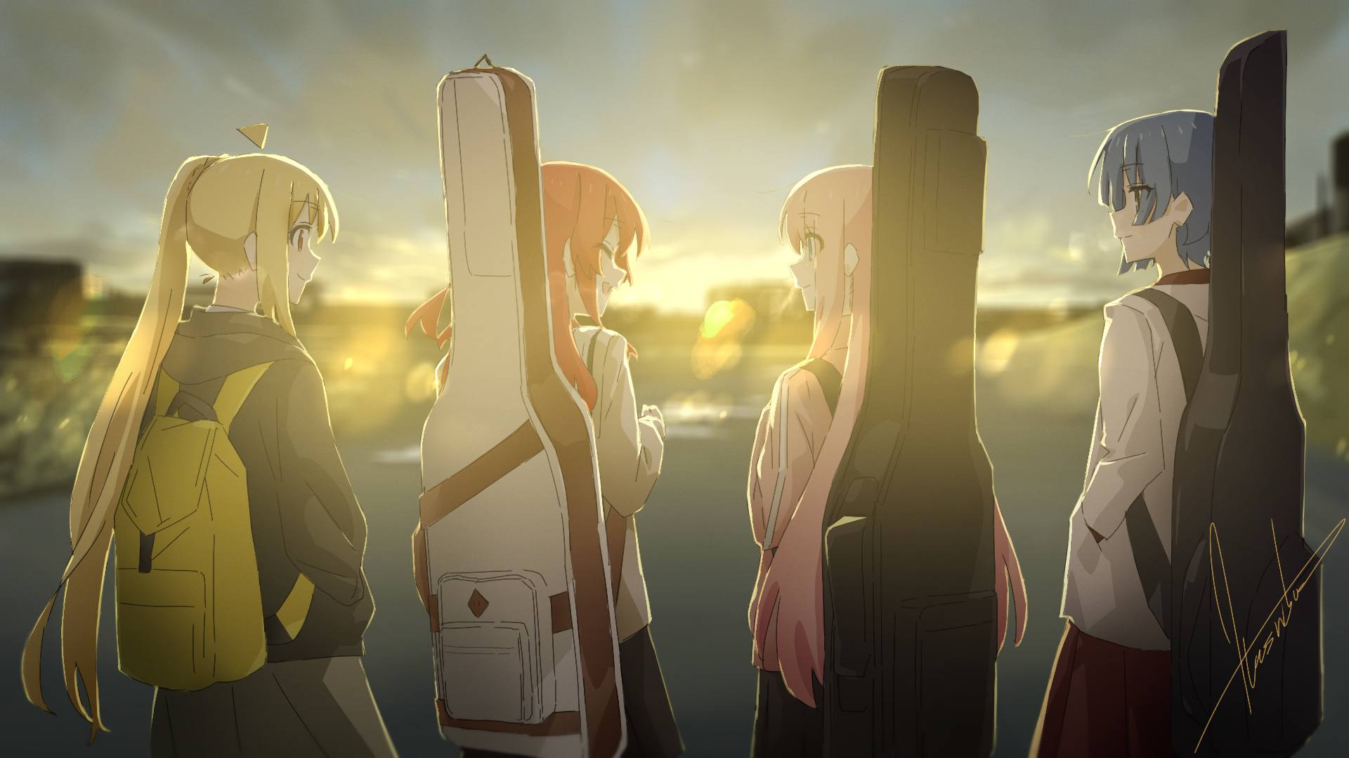 4girls backlighting backpack bag black_skirt blonde_hair blue_eyes blue_hair blurry blurry_background bocchi_the_rock! brown_shirt carrying_bag clip_studio_paint_(medium) closed_eyes commentary_request gotoh_hitori guitar_case hasubou_(isaribashi) highres ijichi_nijika instrument_case jacket kessoku_band kita_ikuyo light_rays long_hair multiple_girls open_mouth pink_hair pink_jacket red_eyes red_hair sailor_collar school_uniform shirt short_hair shuka_high_school_uniform signature skirt smile very_long_hair white_sailor_collar yamada_ryo yellow_bag yellow_eyes