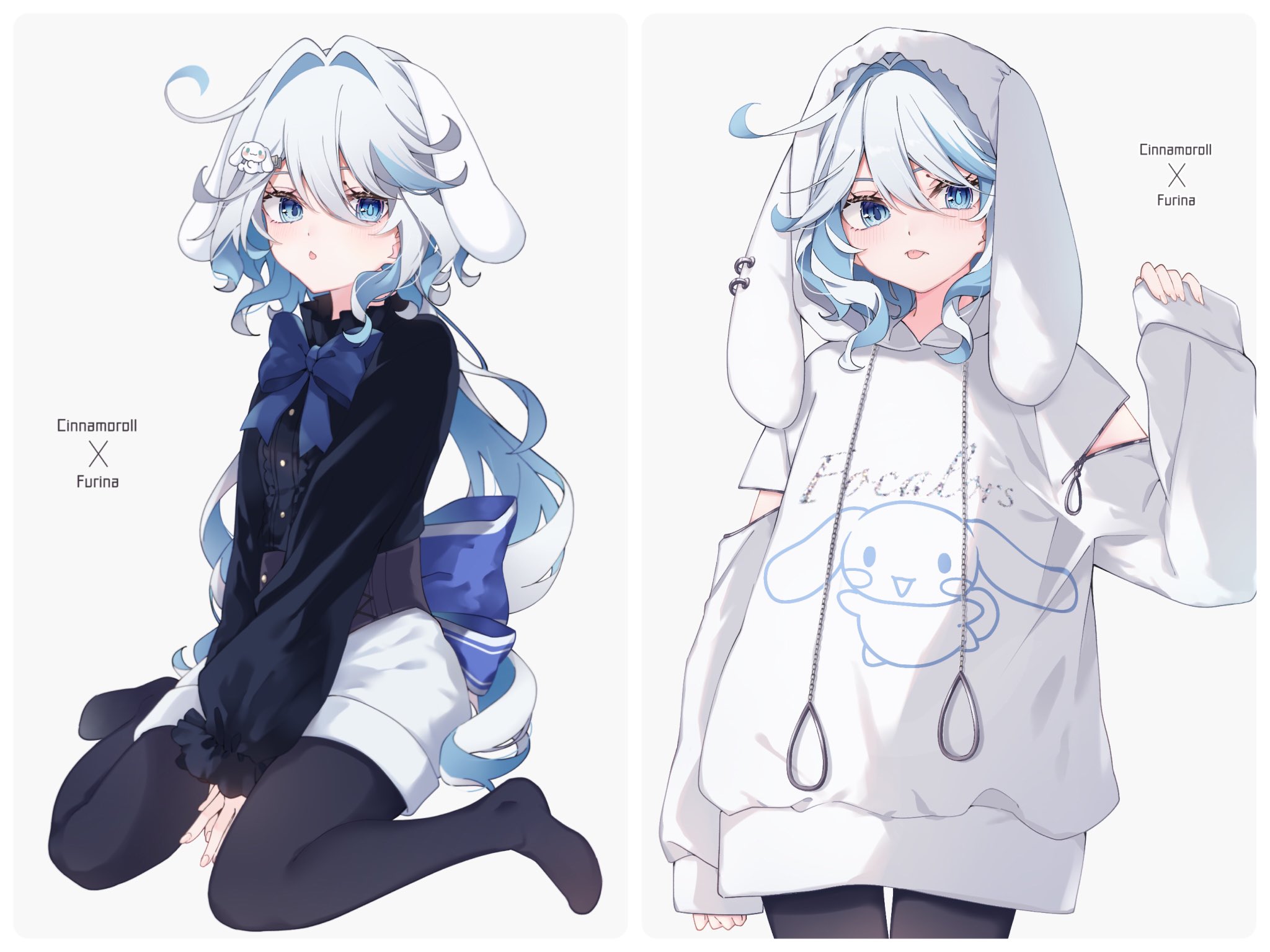 1girl :o animal_ears blue_eyes cinnamoroll fake_animal_ears furina_(genshin_impact) fuwa_fuwa_cinnamoroll genshin_impact highres hood hoodie long_hair mismatched_pupils multicolored_hair open_mouth pantyhose pomepome1207 sanrio shorts two-tone_hair white_hoodie